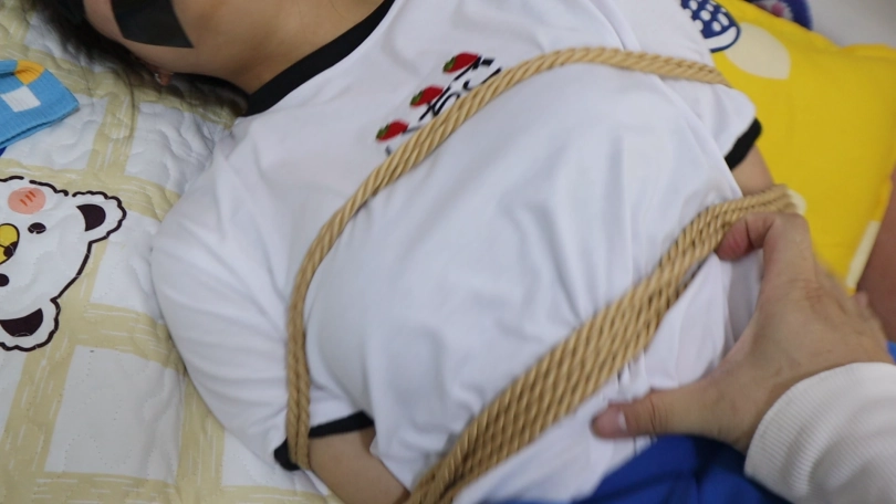 女孩也从睡梦中醒来了,开始疯狂的挣扎但是嘴巴里面塞着袜子,也喊不出来,只能发出呜呜呜呜的声音来以示反抗,很快就被绑好了,连着膝盖和脚腕都被狠狠的绑了起来,看着身边被紧紧捆起来的女孩子,开始把魔抓伸向这个女孩