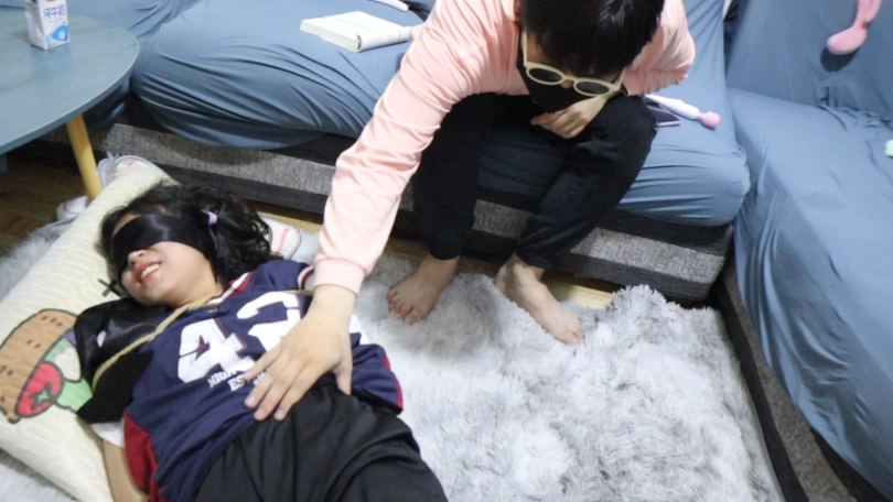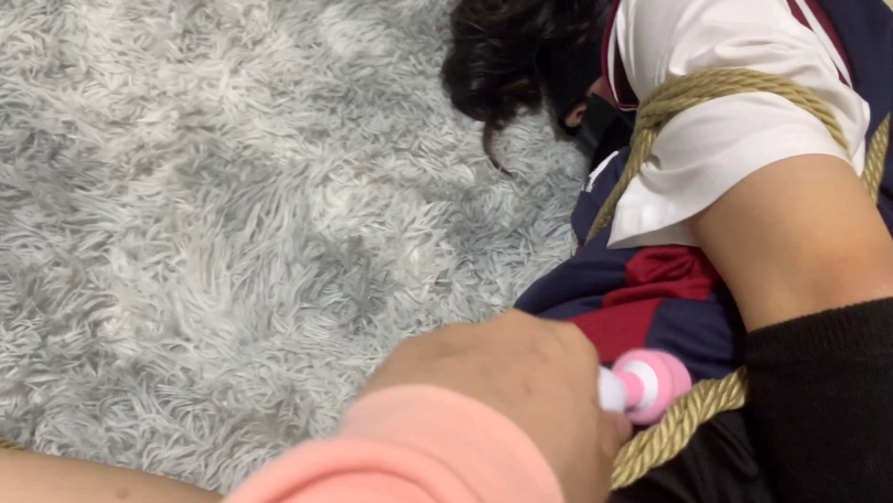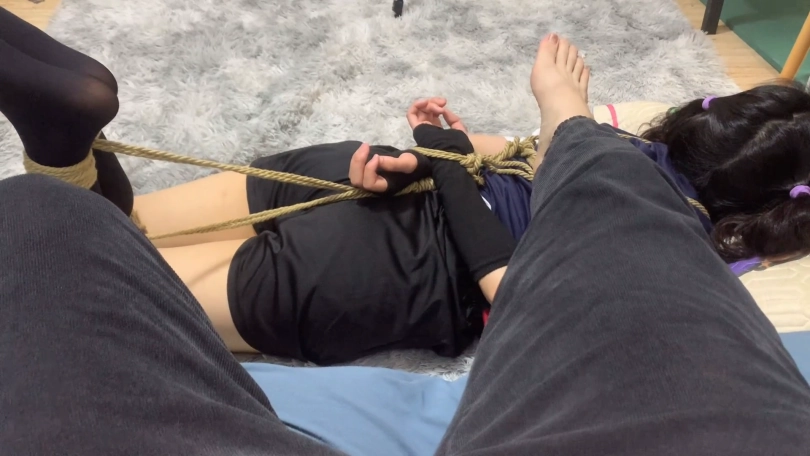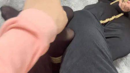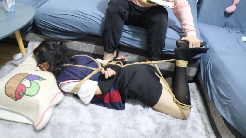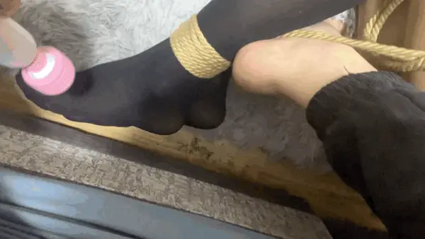 ,把驷马绳子直接卷成股绳了,双脚不停的乱动,再把黑丝小脚完全抓在手上,用腿夹紧两只丝足,这下就跑不掉咯