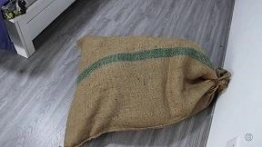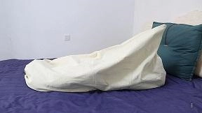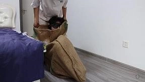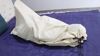 MM穿上性感的裙子打扮得漂漂亮亮的等着老公回来想给他一个惊喜,因为今天是老公的生日。门铃响了,MM迫不及待的走去开门,哪知映入眼帘的是一个带着面具的男人。MM正想惊叫,蒙面人早已把沾有迷药的毛巾捂了过去并推了进去把门关上。MM挣扎了一下昏迷了过去。蒙面人把MM拖到沙发上,把MM捆了个驷马,嘴里塞上丝袜带上塞口球,并带上眼罩。蒙面人拿出一个大号白色布袋把MM从头到脚装了进去,扎紧袋口,扛进卧室丢在床上,自己出去了。MM醒了过来,发现眼前黑漆漆的,想叫却发现嘴被堵住了,想挣扎但手脚被捆住了。MM有点害怕,呜呜叫着蠕动着(挣扎要激烈一点,呜呜叫要动听迷人点),挣扎个10来分钟。这时蒙面人进来了,他看着床上蠕动着的人形袋子很是兴奋,忍不住上去摸她。MM挣扎叫得更厉害了。蒙面人觉得还不够过瘾,拿来一个麻袋,把白布袋从脚到头套进去,扎紧麻袋口放到地上。麻袋鼓鼓的,不停挣扎着,蒙面男心里兴奋,忍不住笑了出来。MM听声音,认出了是老公,呜呜叫着示意老公把自己放出来。但蒙面人似乎不太理会,还拍打MM屁股。MM急了哭了,蒙面人这才于心不忍,解开麻袋把MM放了出来。蒙面人解开MM的堵嘴之物,MM正想发飙,蒙面人深情地抱着MM吻了下去。结尾文字编辑,原来这是MM老公的恶作剧,他看到电视剧美女被捆绑装进麻袋就很兴奋,一直想着什么时候自己也能绑老婆装进麻袋,这次过生日终于如愿了。