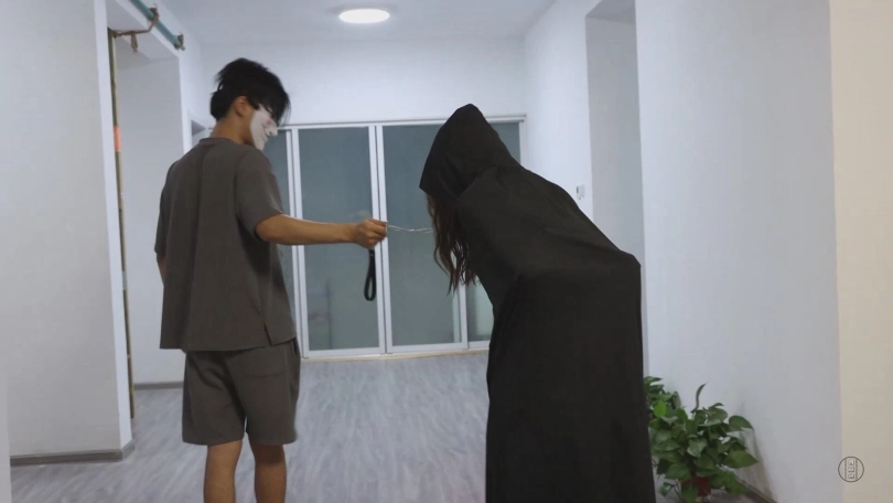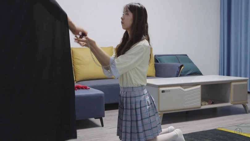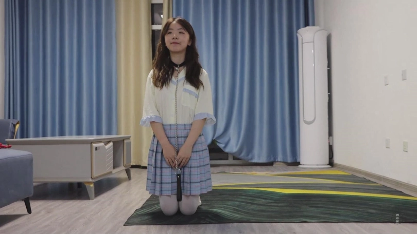 之后,主人将她绑好后又将手铐铐了回去,让她自己去脱缚,小清费了好大的力气才在蒙眼的状态下摸到床上的钥匙,等她解开束缚时,主人已经离开,然而客厅中却留下了主人的新任务。