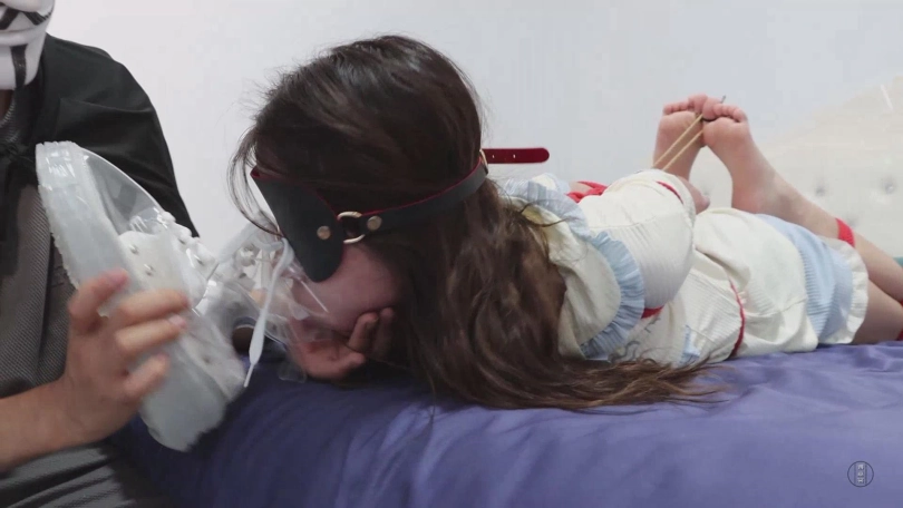 小清呜呜回应着,跪在床边背对神秘人,将双手背后呈直臂的状态放好,神秘人将绳索搭在小清的身上。而后,小清十分顺从的被绑成了直臂驷马的样式,不仅嘴里塞着自己穿过味道最大的白色冰冰袜,而且眼睛也被眼罩蒙住了,脚趾和手指也被绑紧,这是自缚不可能做到的紧致程度,小清享受般的轻哼起来。