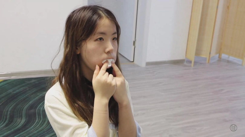 在小清点头表示配合后,神秘人将小清嘴里的白色中筒袜缓缓取出来,并调侃了一句。