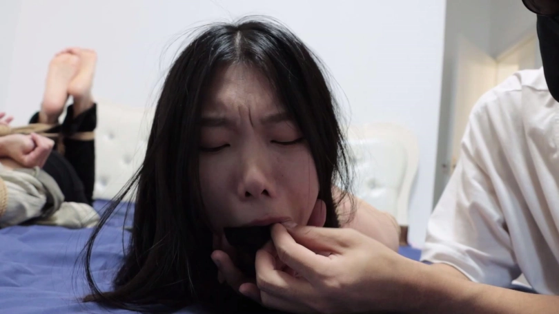 剧情:美女琪梦下班回家发现自己表弟竟然被人捆绑用口球塞嘴捆在家里,正准备给表弟解开时,被埋伏在家中的入室劫匪捂嘴劫持。
