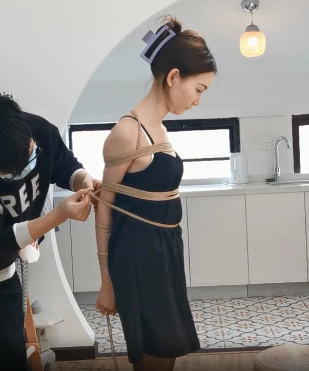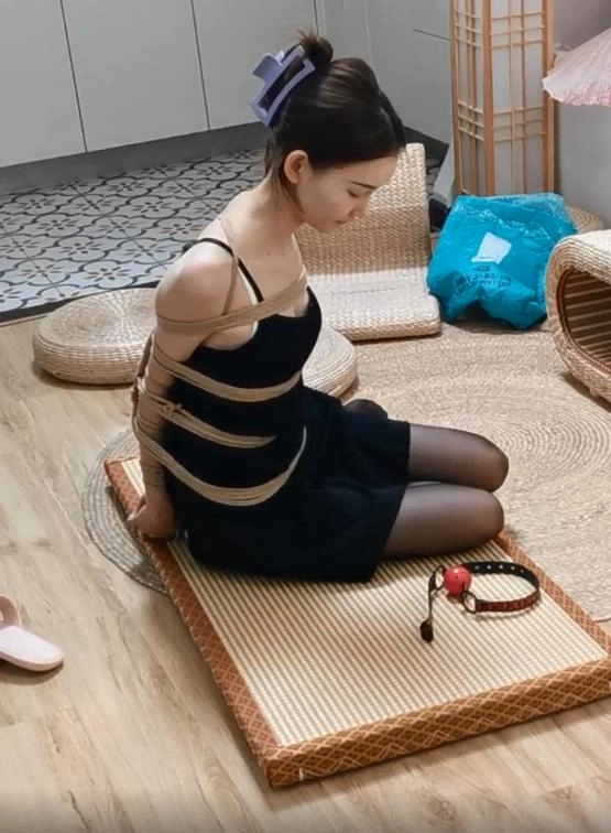 模特果果,多绳直臂捆绑,吊带连衣裙配黑丝,口含口球捆绑放置,绳子偏松散了点,模特却很唯美。