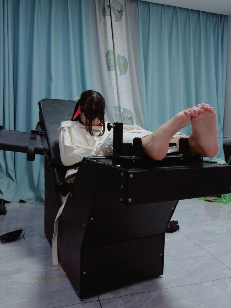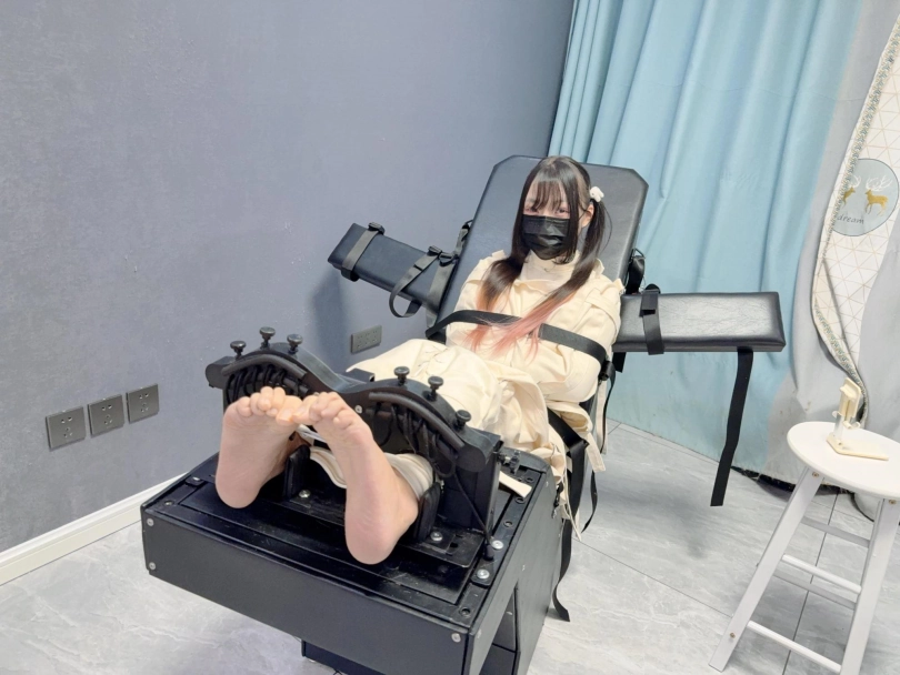 拘束:全套帆布拘束衣+拘束束腿,只露出脚底,然后把糖糖固定在刑床上,锁上重足枷,用束缚带加固固定在重刑床上。足枷固定脚趾,整个脚底被迫顶起来,一丁点都动弹不得。