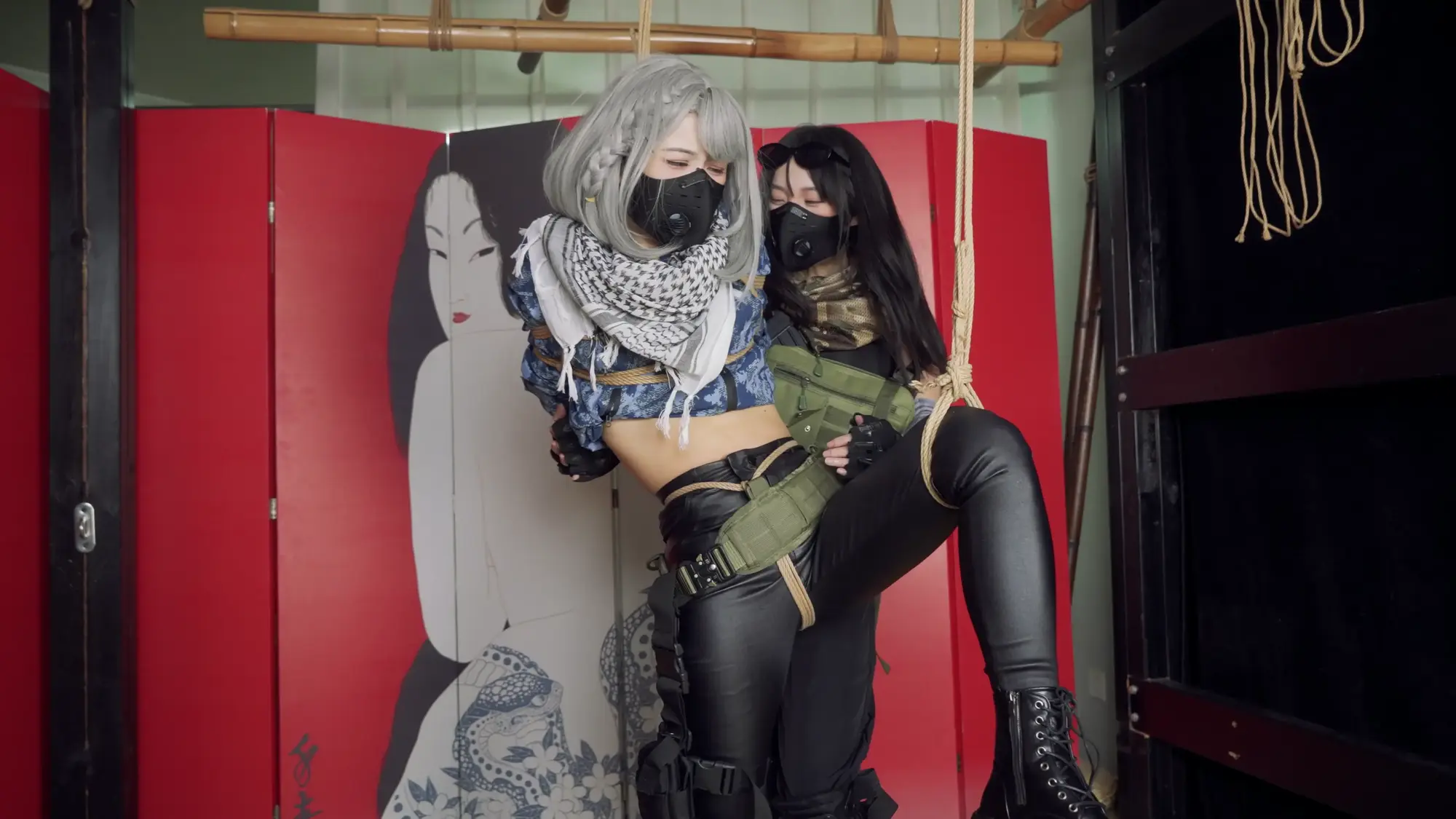 剧情这次也很简单,小0扮演的麦晓雯日常跑刀搜刮物资,运气爆表捡到了非洲之心,正当她准备撤离的时候,被嗷嗷扮演的露娜抓住,露娜夺走了非洲之心,并将麦小鼠单腿吊缚起来各种玩弄,正当露娜玩的开心的时候,一旁的小兵听到动静,举枪治服了露娜,也将她捆了起来。