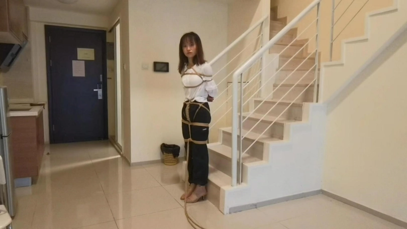 静静第一次体验绳艺就绑了个日式股绳坐楼梯放置,还是比较腼腆的,由于中途手麻了,只能被迫先解开休息一会在继续绑