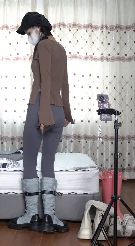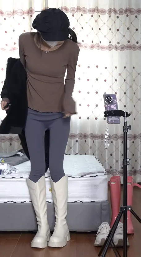 女生逃课之后和朋友打视频,分享自己的靴子,一边讲解一边试穿
