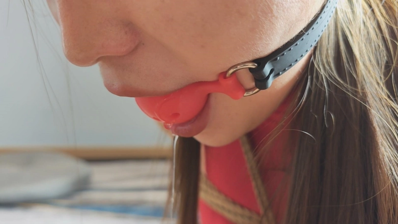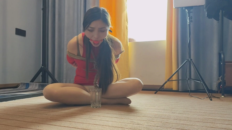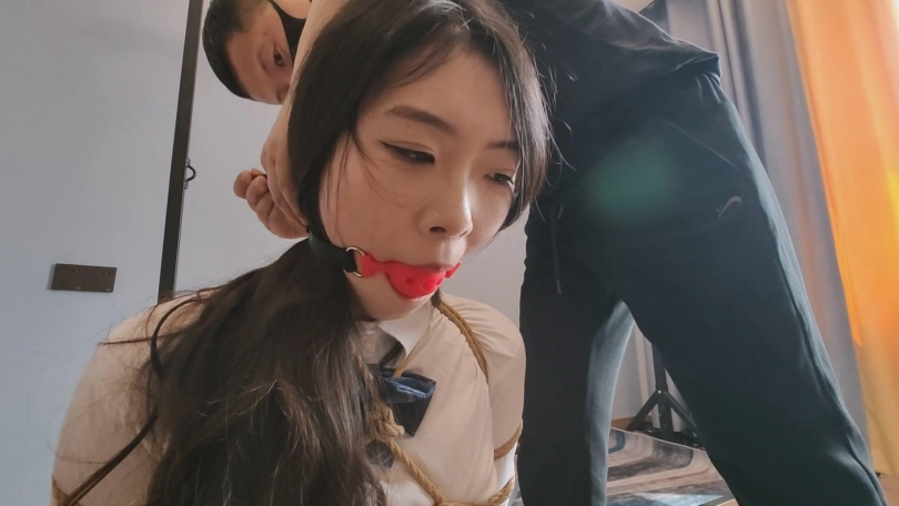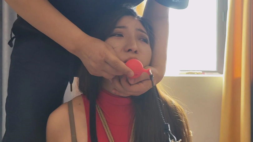 歹徒将母亲押到关押女儿的地方,三女全被带上口球关了起来,只能默默的流口水。