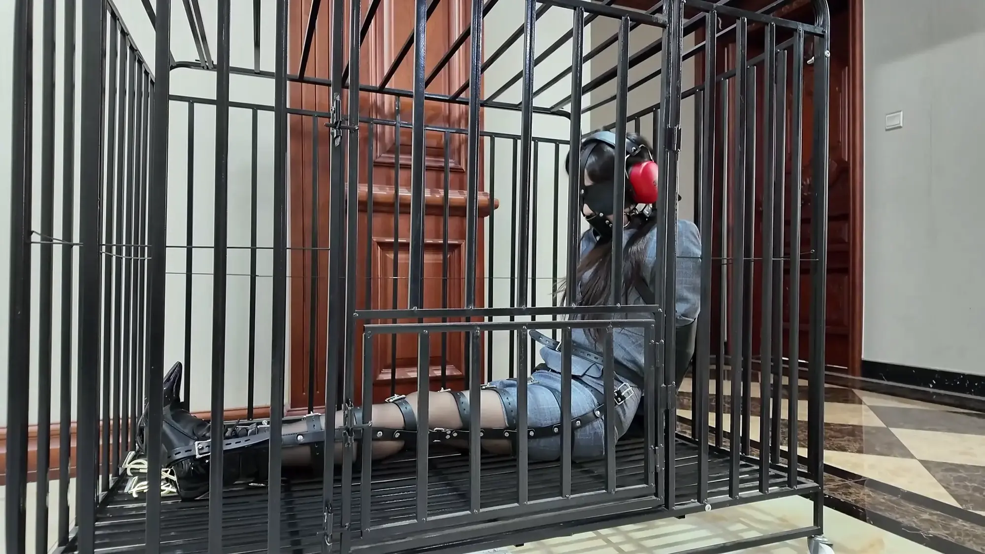 上去了之后,老板说:请我们亲爱的卉萱小姐进去休息一下吧,并指了指面前的笼子,卉萱瞪大了眼,这哪是床,明明是软禁她的囚笼,但是可由不得她,老板给她的腿绑上了最严密的束腿装置。防止她逃跑,然后就粗暴的塞进笼子里。卉萱靠在冰冷的金属栏杆上,试图撞开笼子,金属发出轻微的声响,但是门锁非常牢固,同时眼睛看不见,耳朵也听不见,只能不停的发出呜呜呜的声音,希望有人救她依旧是皮带,类拘束衣束缚,这次的捆绑方式应该是很少见的,却可以出色的完成,可见其实力