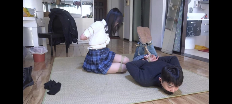 女生慢慢推开门进来,发现男生被绑在沙发上(手脚都绑着,嘴里塞了三只短肉丝袜,并带着口球),女生手足无措,男生呜吗,女生慌忙着取下男生的口球,随后一只只取出男生嘴里的短肉丝袜。 劫匪回来了。劫匪让女生脱下鞋子,脱下袜子,一只慢慢塞进男生嘴里,另一只勒(蒙)住男生的嘴。劫匪让女生换上新的袜子,穿上鞋子,给女生绑个五花,腿部捆两道,最后给女生绑个驷马。 男生挣扎着,帮女生解开了驷马,女生挣扎着坐起来,两人相互挣脱。 劫匪回来了,威胁女生再次脱下鞋子和袜子,肉丝袜一点点塞进男生嘴里,然后让女生用胶带封住,给男生随便绑个驷马。劫匪让女生穿好袜子,再给女生绑个五花,腿部绑两道。女生帮男生解开了驷马。随后男生解开了女生的绳子,女生最后一点点扯出男生嘴里的长肉丝袜