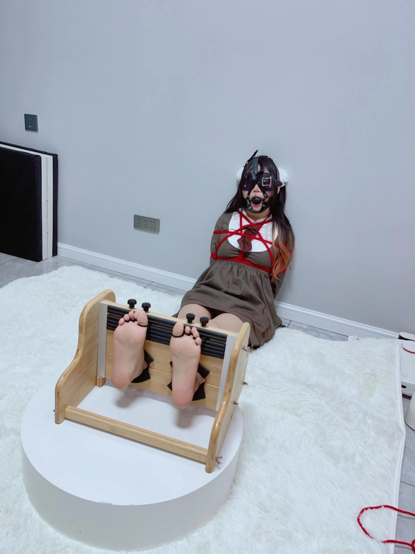 一阶段:足枷不间断挠痒地狱-上半身日式紧缚,给妹子戴上眼罩和马具口球,两只脚固定在足枷里,每一根脚趾都固定在足枷上,完全暴露脚底。