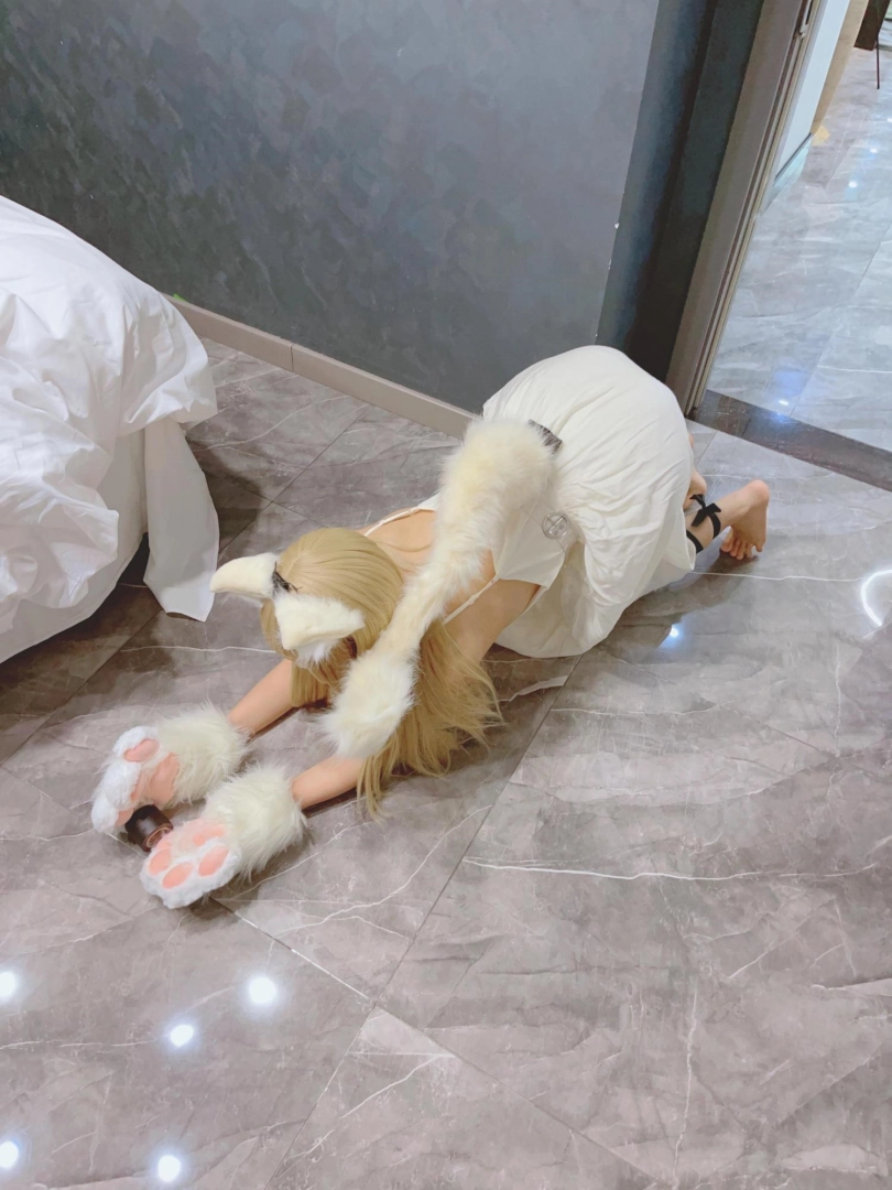 服装:黄豆粉cos服,蝴蝶结带铃铛,裸足+腿部绑带