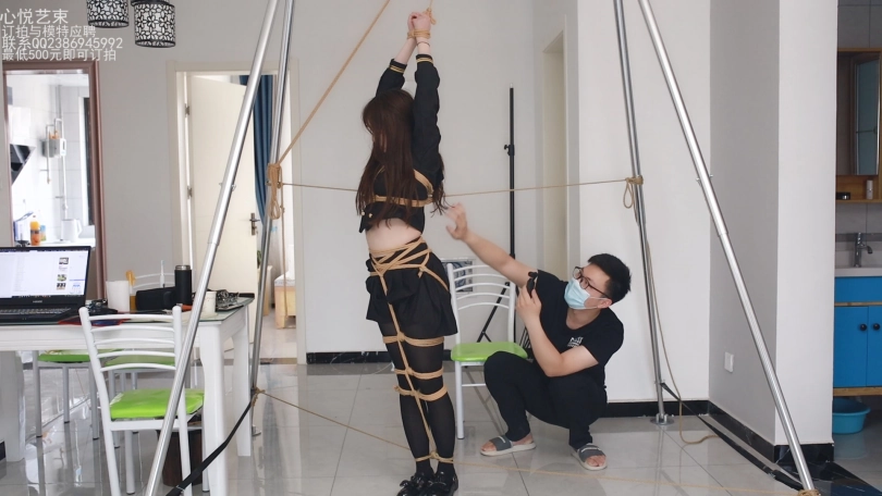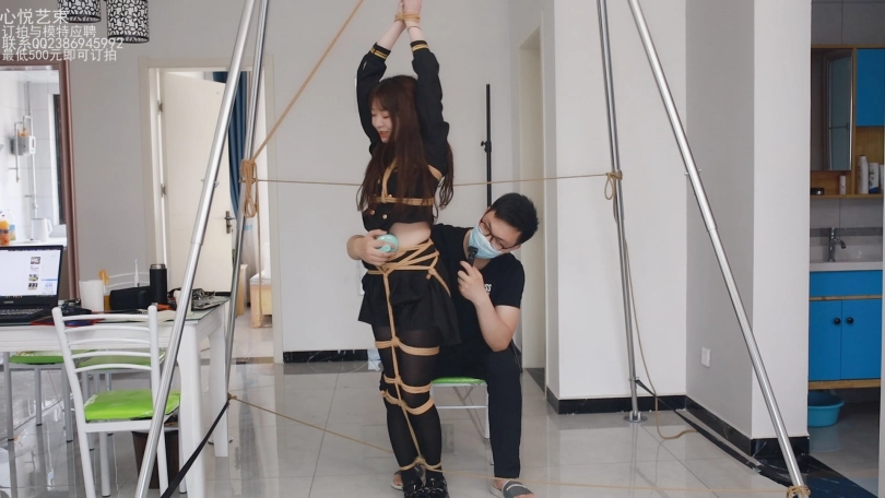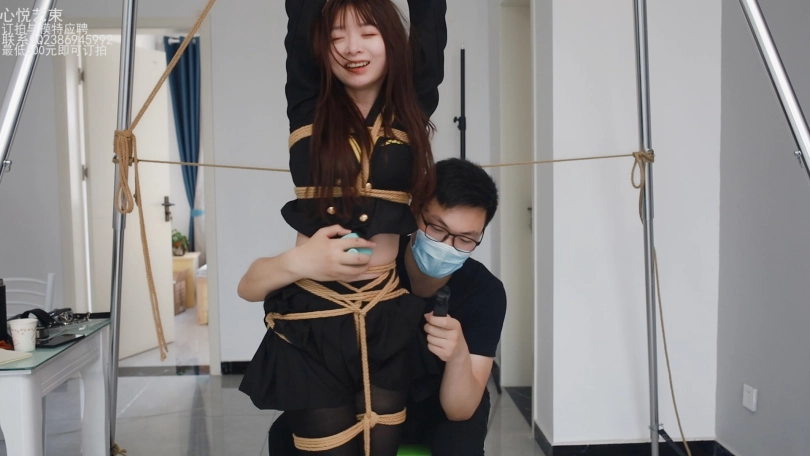 筱筱穿着黑色JK黑色丝袜,双手吊起,全身被绑成一根人柱一样。被一双魔抓疯狂TK敏感的腹部,腋下和膝窝。为了防止筱筱挣扎,方便下手,把她脚踝和腰部分别固定在四周得柱子上哈哈,最喜欢她气急败坏又无可奈何得样子。