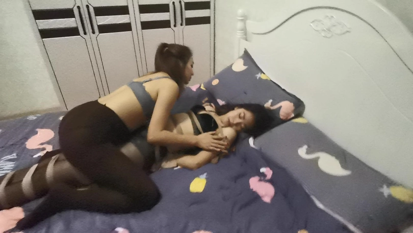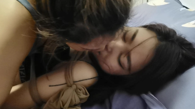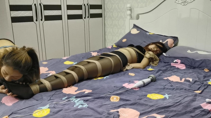 接下来轮到瑾萱体验捆绑,若灵用丝袜将瑾萱全身捆绑起来抚摸着她的身体,手不断的在瑾萱敏感部分游走。并亲吻着瑾萱。若灵用一条连裤袜套在瑾萱的头上。骑在瑾萱身上,拿出[不可描述]棒放在两人敏感部位中间,打开开关,两人一起体验着这种强烈的刺激感觉,她们的呻吟声也越来越大。。。