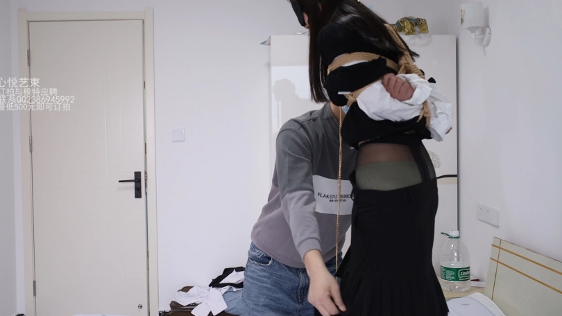 时尚黑裙小姐姐来做客,在客厅被袭击捆绑起来,戴上项圈牵引只能无奈跟随主人去房间,又被脱去鞋袜,黑丝大长腿一览无余。中间还有脱裙子和穿丝袜嘿。(就是脱下裙子换上裤袜那段没拍到有点尴尬)。