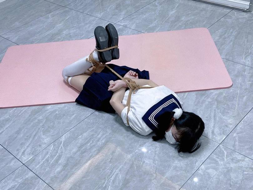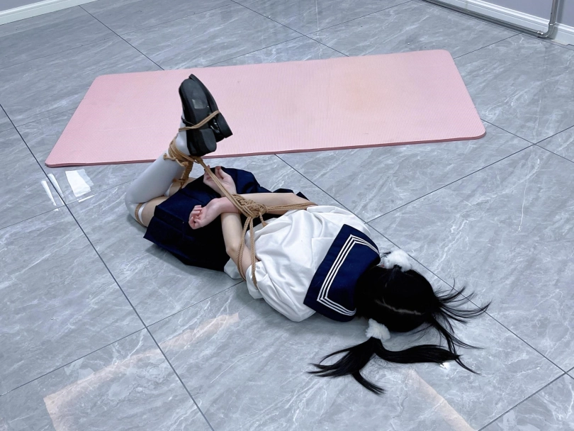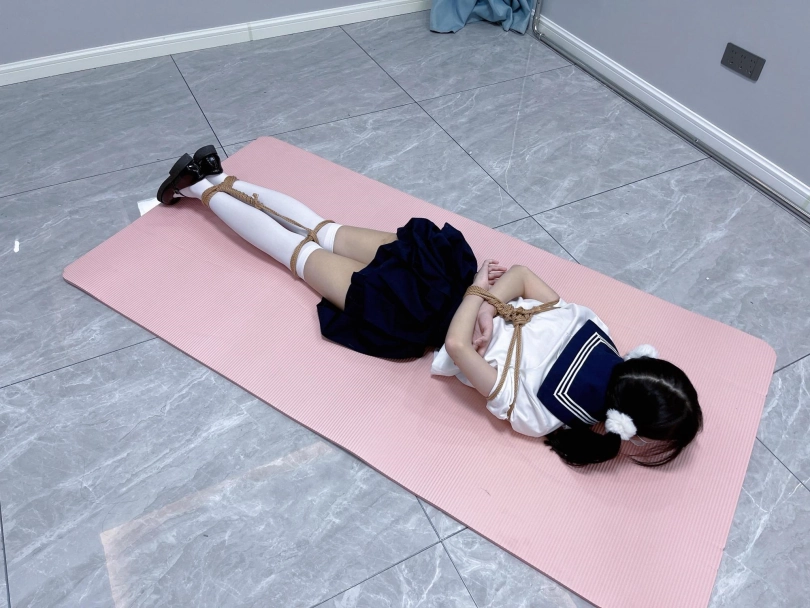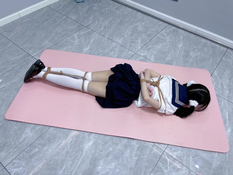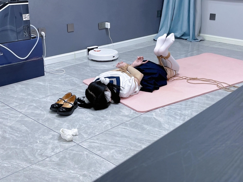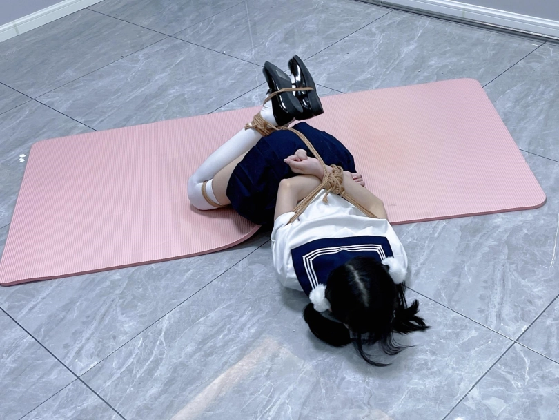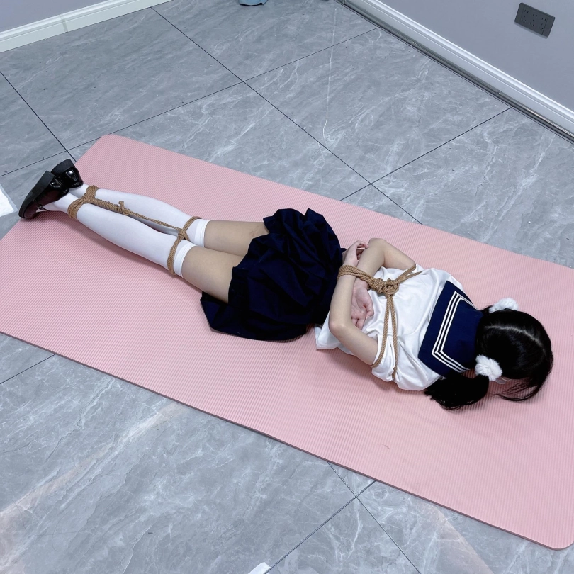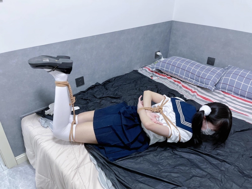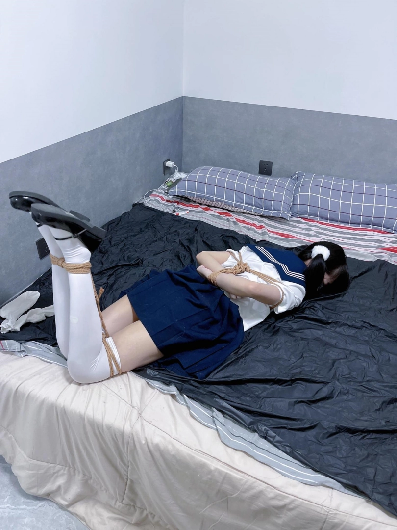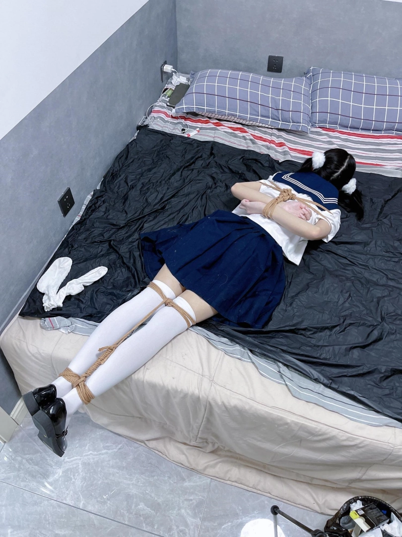 茶茶出游回家后没有关好门,坐到床上后感觉有点困,衣服都没换便躺下睡觉了。 这时坏人悄悄溜进来准备窃取钱财,看床上躺着一个人,便以防后患将茶茶绑了起来(绑法:日式小高手,并拢绑住脚腕)。