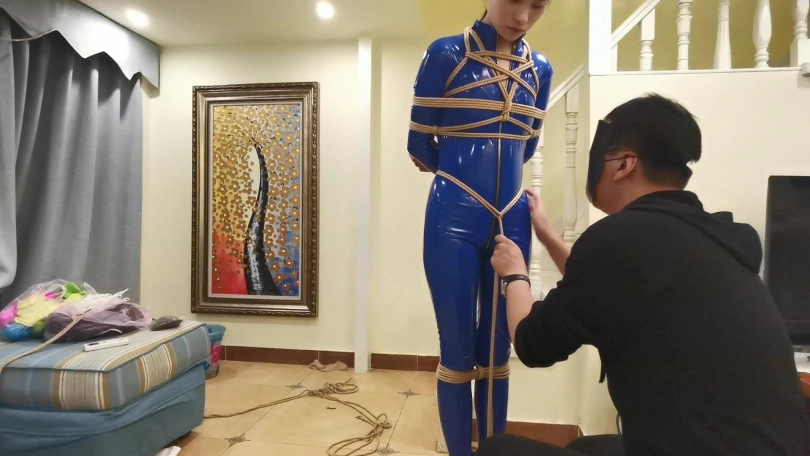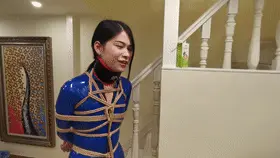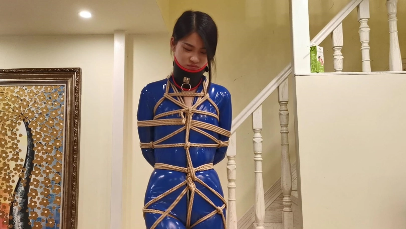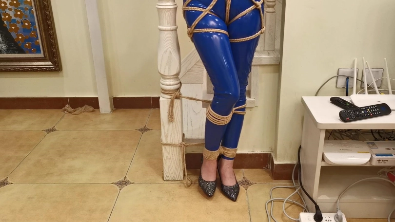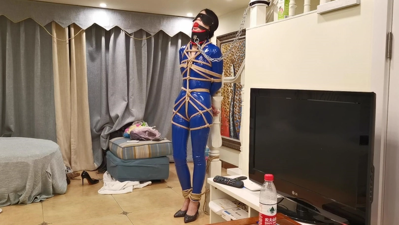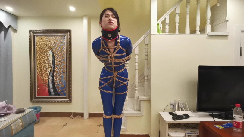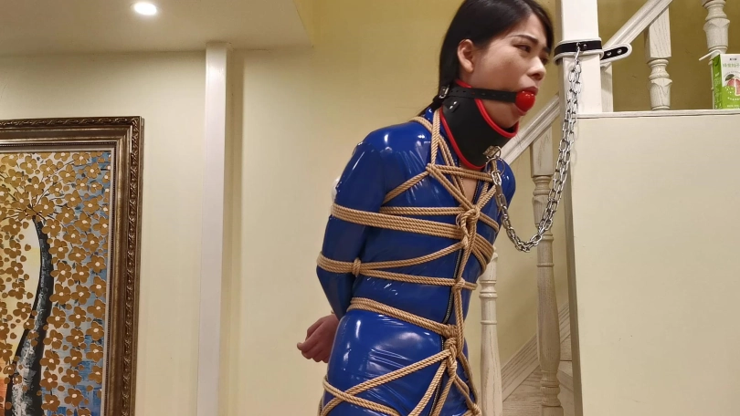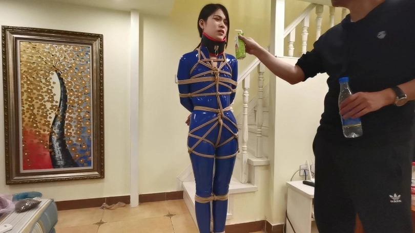 穿着一身蓝色皮衣,高跟鞋。被绑在楼梯栏柱上。脖子被戴上强制抬头的脖套,并用铁链拴起来。旁边放着饮料,想要喝到却很艰难,不断的移动最终成功喝到。长时间的站立让小冷的脚丫像触电一样的疼,1小时的罚站让小冷非常煎熬的扭动身体挣扎。