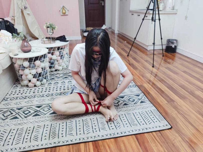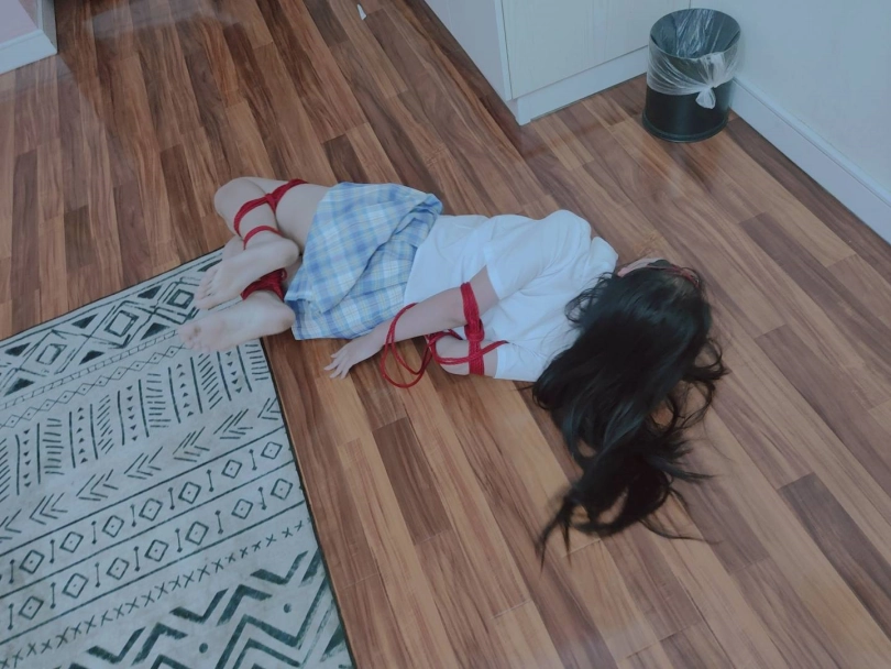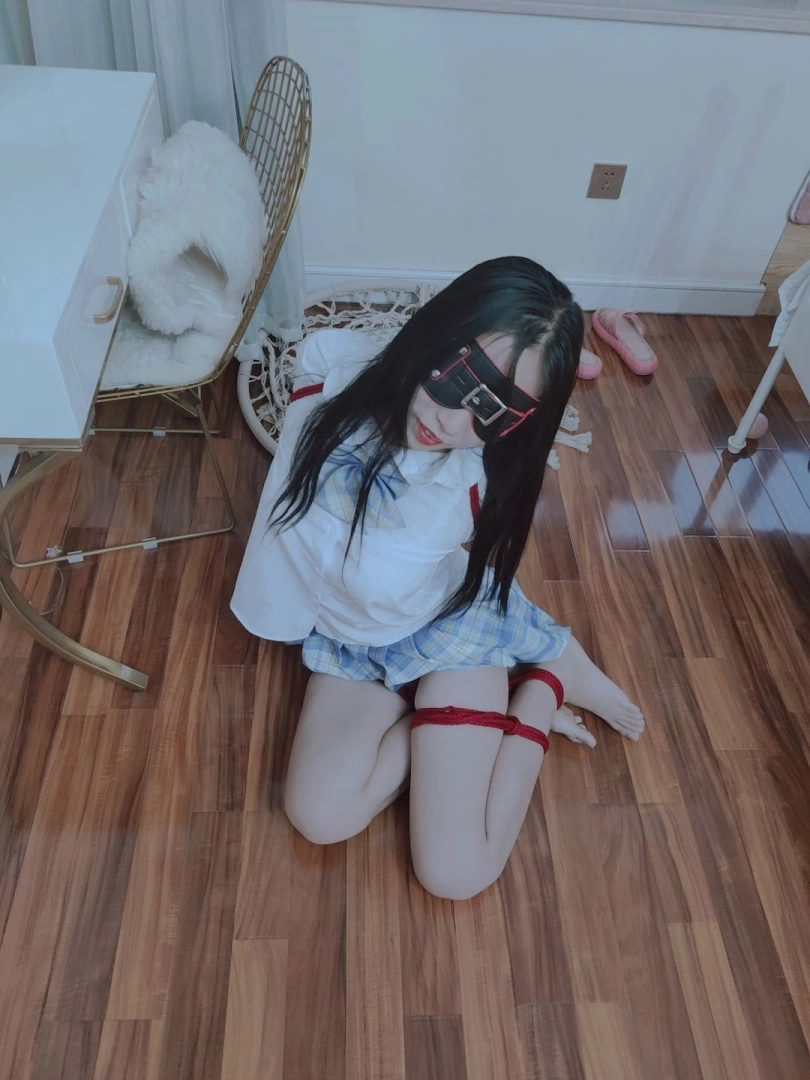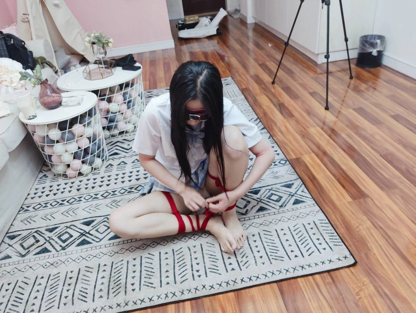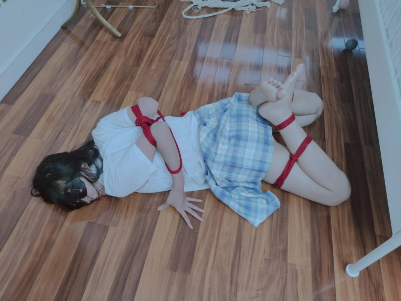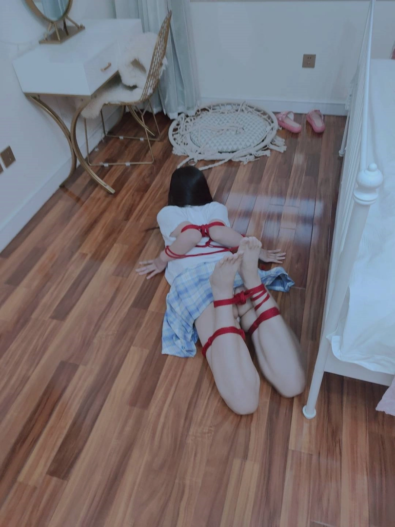 把可爱的长腿少女直臂紧缚,然后双腿分别折叠捆绑后把两只脚腕也绑在一起,可怜的小姐姐就变成了一团肉肉。然后要求她自行脱缚~