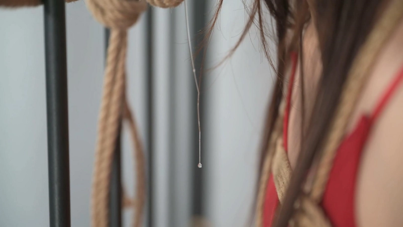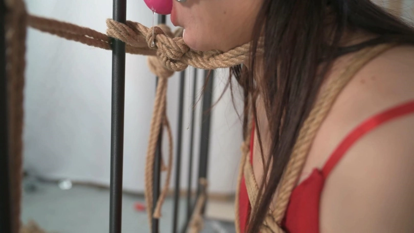 冰冷的铁床有这么一个长腿妹子绑在床头作装饰物是再好不过了,上身采用日式捆绑可以让她固定较长时间,有一根绳子悬吊起来用作固定,脖子也用绳子拴在床头上,膝盖处和脚踝用绳子分开固定。闲的无聊时就给她来个TK调剂一下。