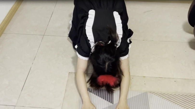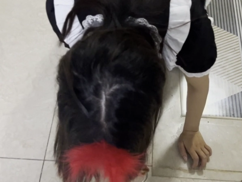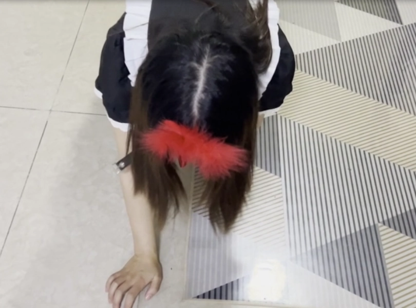 2.礼仪侍女站姿训练。然后跪下低头托举皮鞭。