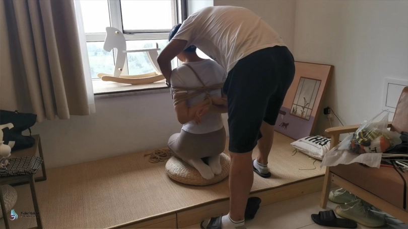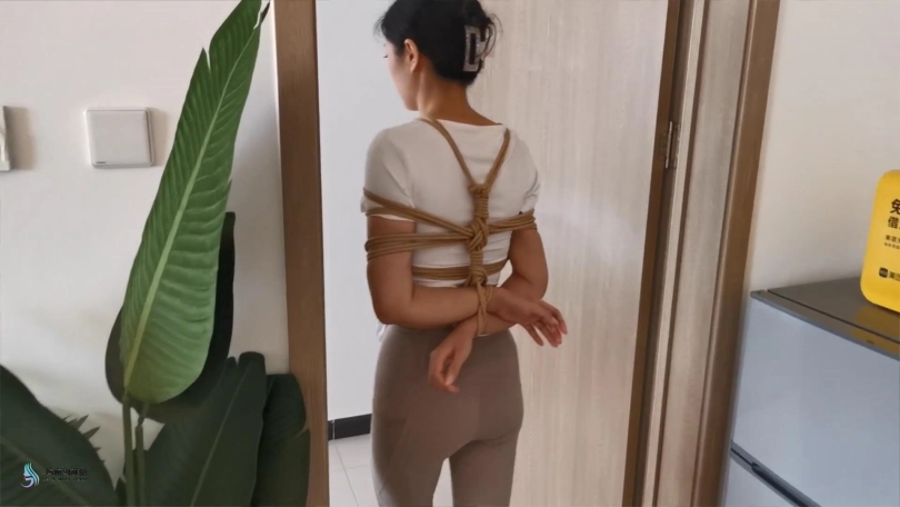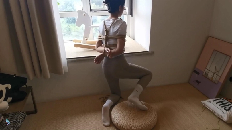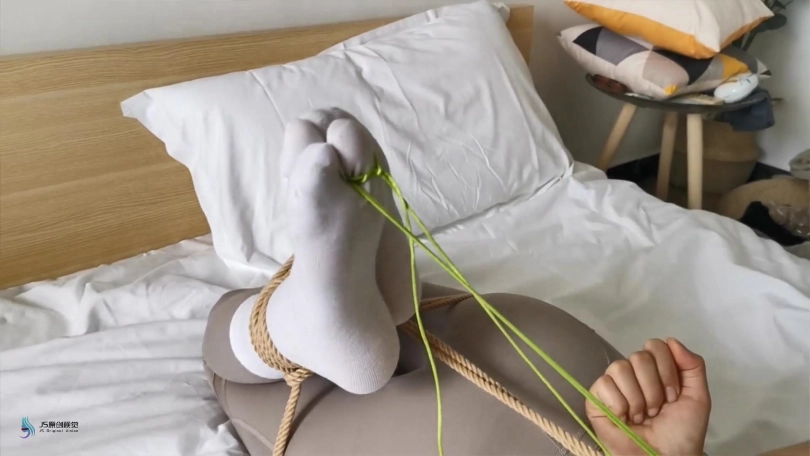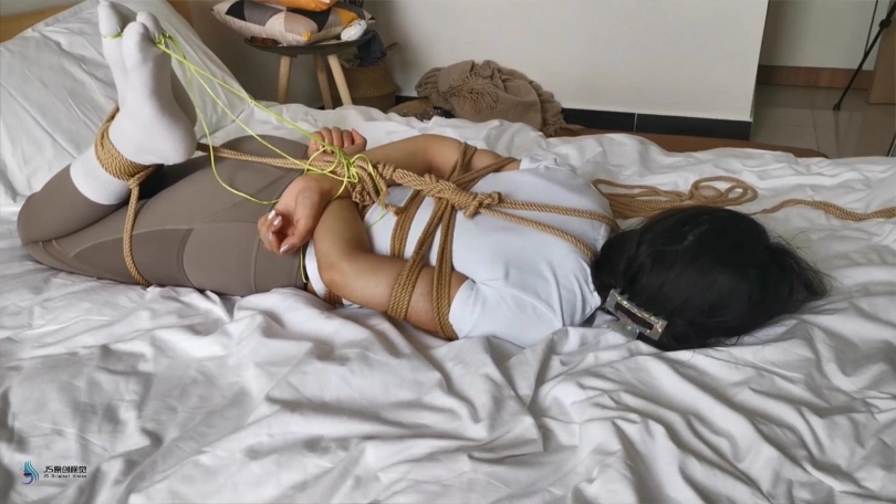 艾可穿着瑜伽服和白棉袜,被驷马紧紧的捆绑在床上。脚趾也不放过,也要绑上。顽皮的艾可还要体验被吊起荡秋千的感觉,屋里没有能吊的地方,只能抓起她身上的绳子,把她拎起来体验下。太不老实,用丝袜塞进她的嘴巴,嗯,终于安静了。。。
