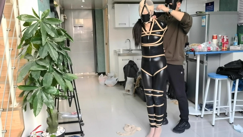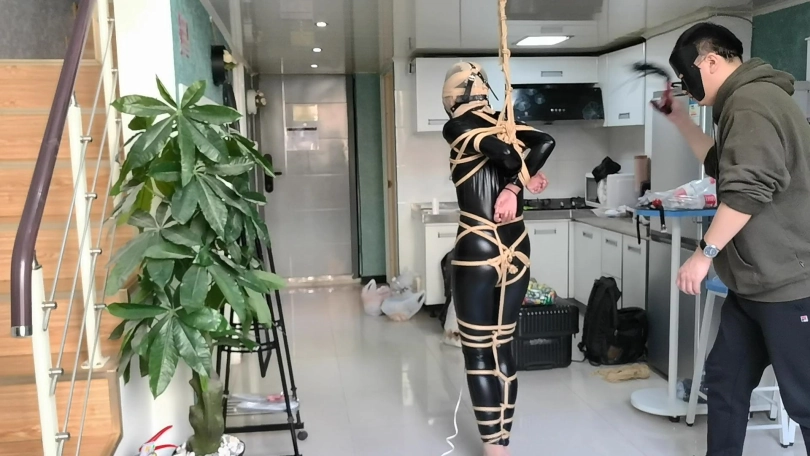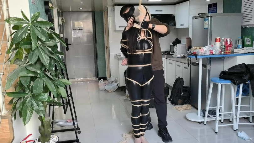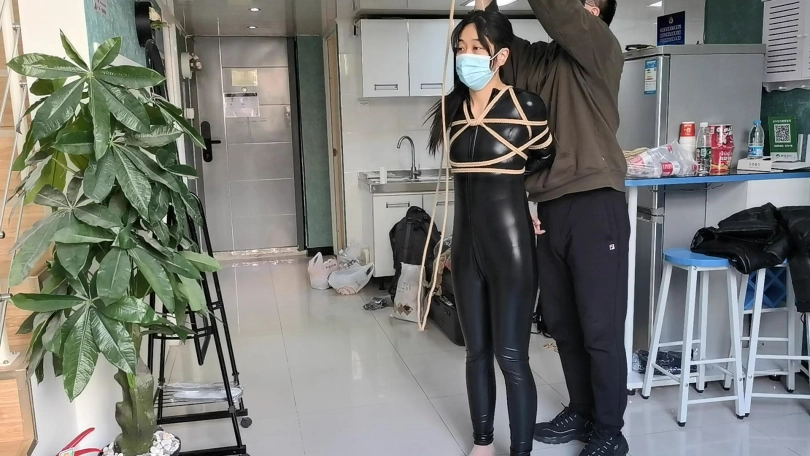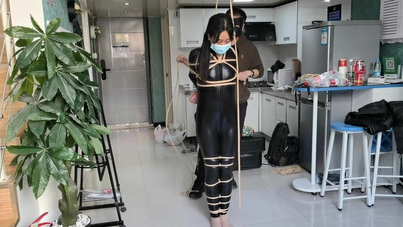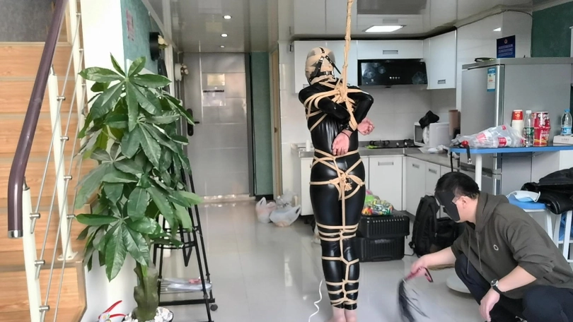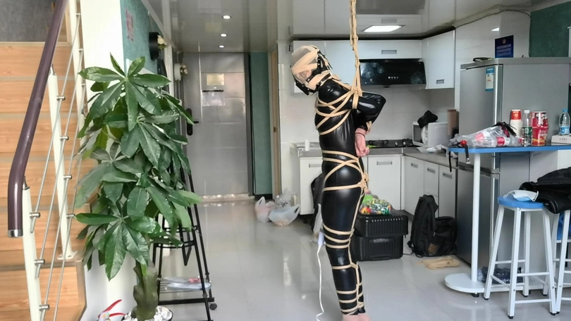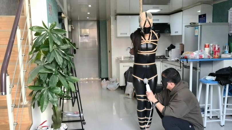 她穿者黑丝涂胶衣,全很被绳子紧紧的捆绑起来,并悬吊固定。这让她不得不踮起脚来减轻自身重量。用一条连裤袜套在她的头上,并蒙住眼睛。用马具性口塞堵住她的嘴巴。在她的阴D处固定快乐棒,不断的刺激着她并用皮鞭抽打她。。。