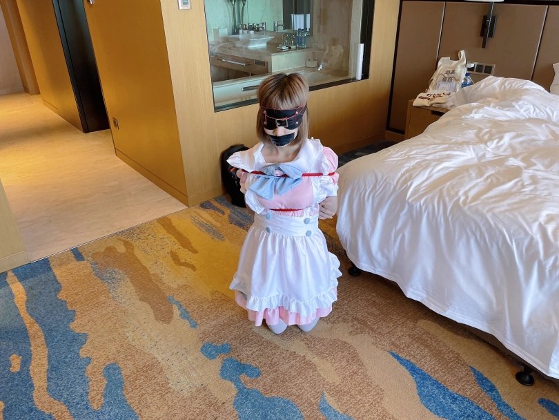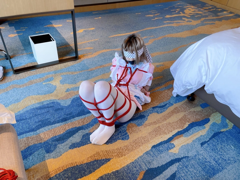 首先用胶带蒙眼封嘴、用布条勒住。脚腕并拢捆绑后把双腿折起,这样双腿不但折叠绑在一起,两条腿同样不能分开。上下左右全方位拘束。然后把少女的上半身和大腿绑在一起,强制弯腰。最后把少女的脖子、胸口和大腿折叠起来。这样一来,可怜的少女就像被绑架的肉货一样绑成一团、动弹不得啦~