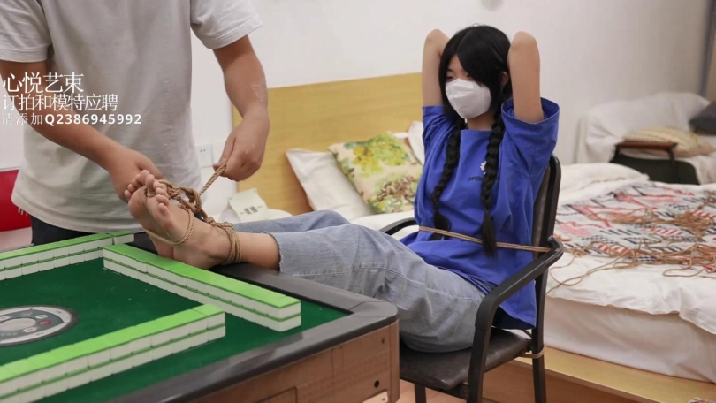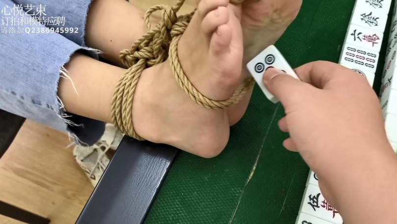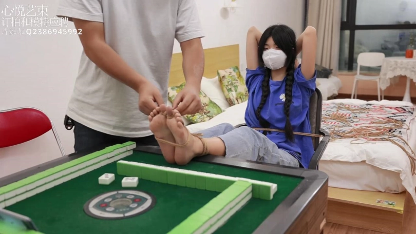 【心悦艺束】超可爱得00后妹子UU试镜最终章,双手脑后缚,脚掌脚趾全绑麻将TK,试镜得地方刚好有一个麻将桌,干脆就让UU体验体验不同麻将花色摩擦脚底都是什么感受。
