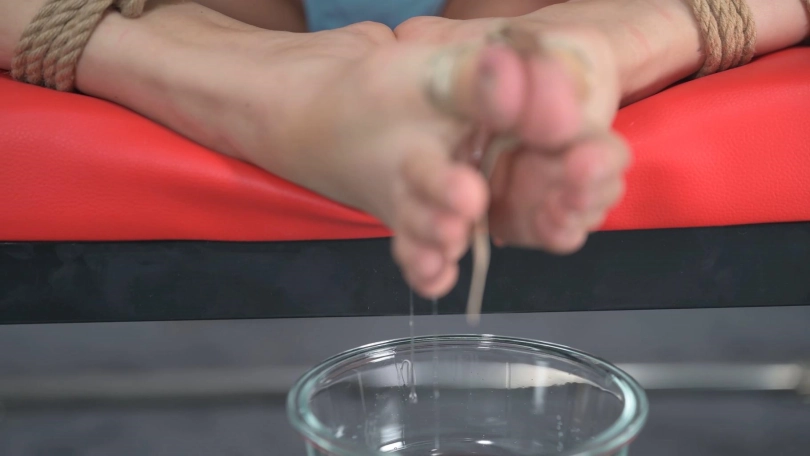 把妹子胳膊反扭夹持的固定效果很牢靠,妹子蜷着身体非常难受,更促进了她分泌口水,大量滴落的口水流到双脚上,加入冰块,两者在双脚形成的空间充分融合后滴入水晶碗里,在这持续的高温天,有这么一个冰口水制造机是不是很惬意。