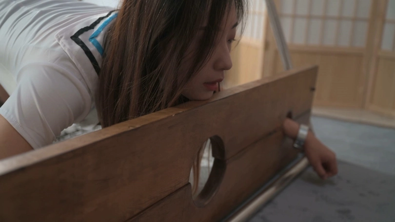 设计的这个姿势,貌似比较简单,其实是相当难受的,绳师特意提前试了试,木枷用来固定手的地方与地面有一些距离,而胳膊肘又不能完全支撑在地面上,所以很担心绳模不能坚持很长时间。不过萱萱的敬业能力还是很强的,拍她前面的时候她为了支撑身体,竟然用牙咬着木枷,还要承受TK和打屁股,而且绳师这次TK特别卖力气,真的要为她点个赞了!