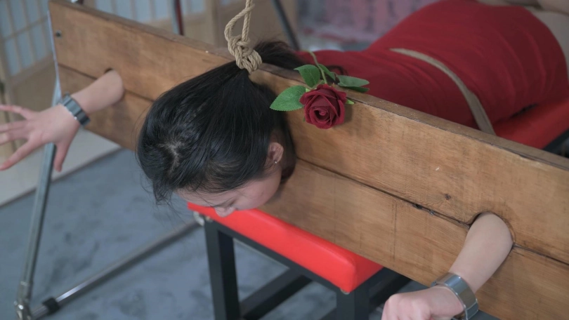 情人节设计的游戏,妹子穿了短裙丝袜和高跟,让她趴在凳子上,木枷固定头和双手,双脚翻折用绳子捆得牢牢地,用玫瑰花杆TK特别应景,妹子不断扭动身体却无能为力。