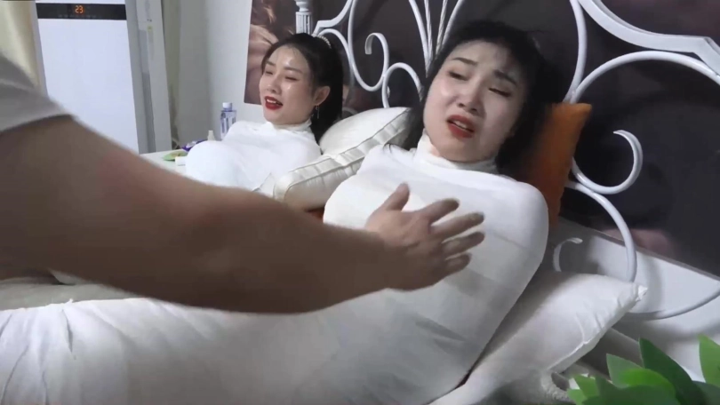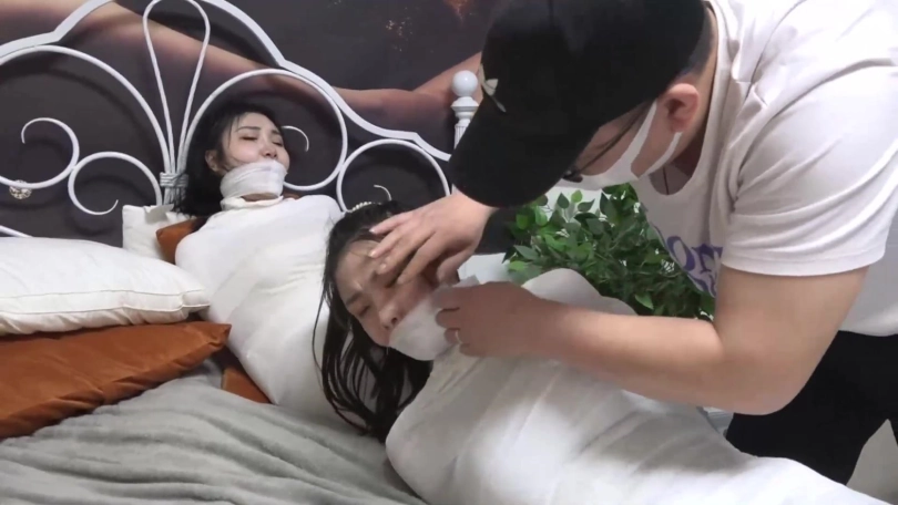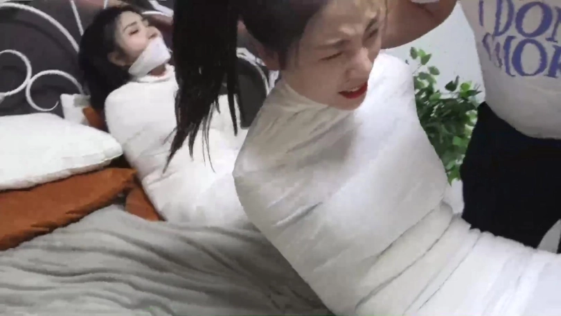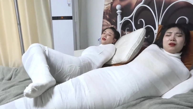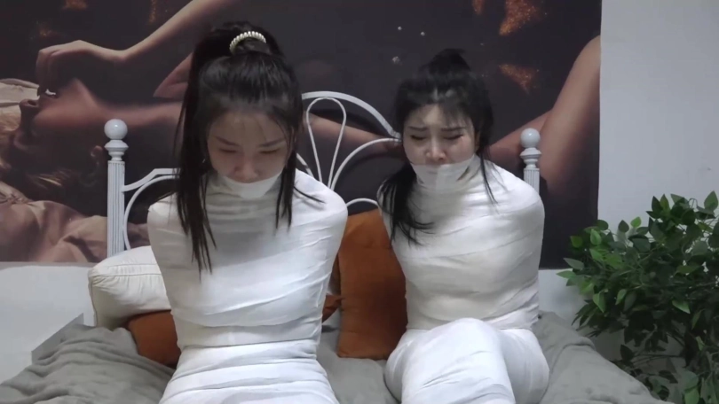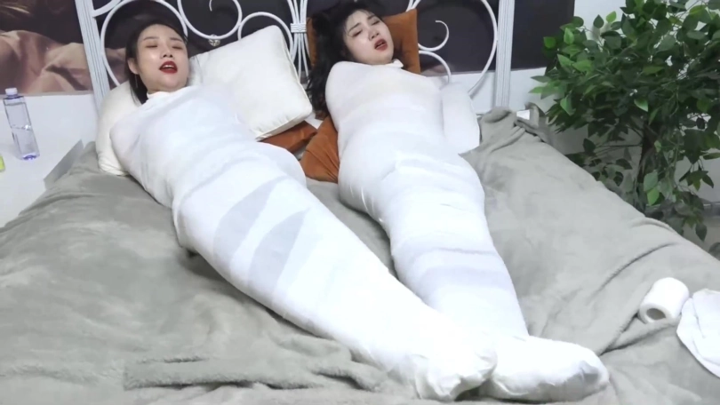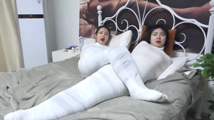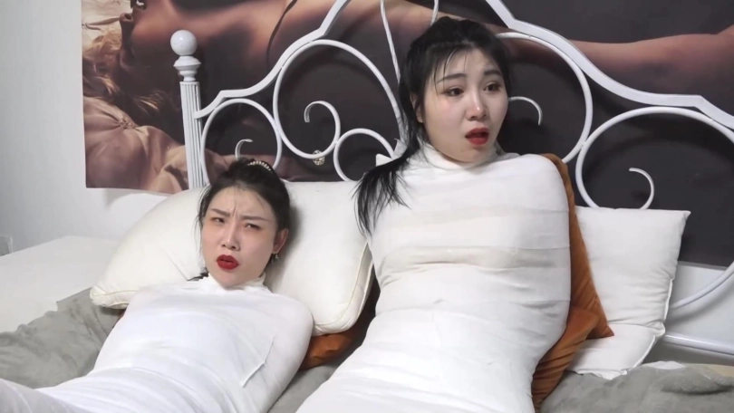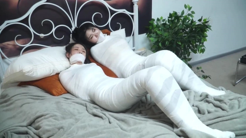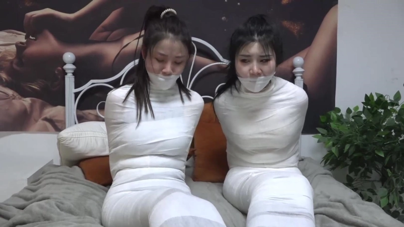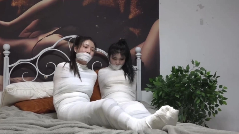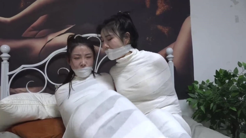 2位美女互相陷害,木乃伊绷带上涂抹胶水导致2人被永久做成了只能蠕动扭曲的人茧,而无法做任何反抗的她们唯一能活动的小嘴也被封死。