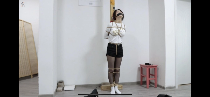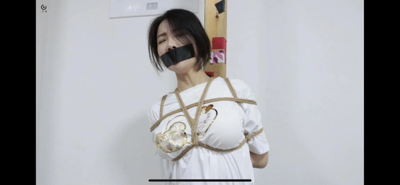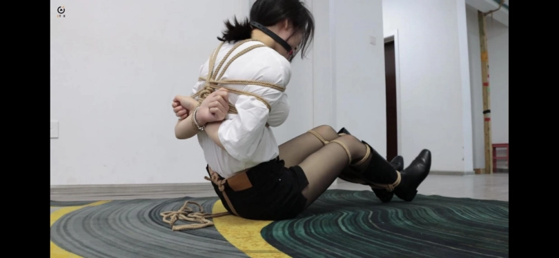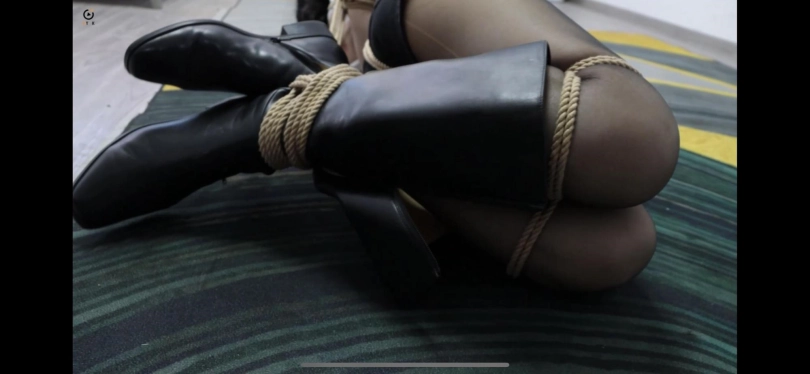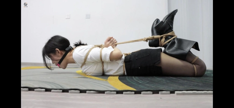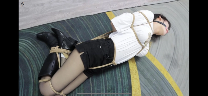 押着女主到家以后,债主解开手铐脚铐,开始用绳子把女主上半身紧紧捆绑起来,膝盖上下也捆绑好,接着绑脚的时候发现女主穿的是靴子,债主拉开了拉链,发现女主脚上还穿着黑丝+棉袜,忍不住还调侃了下。把女主脚腕交叉,在脚腕隔着靴子紧紧捆绑起来,并且用上了驷马捆绑,绑好后留下女主独自挣扎。嘴也堵上,然后债主进屋找财物去了。