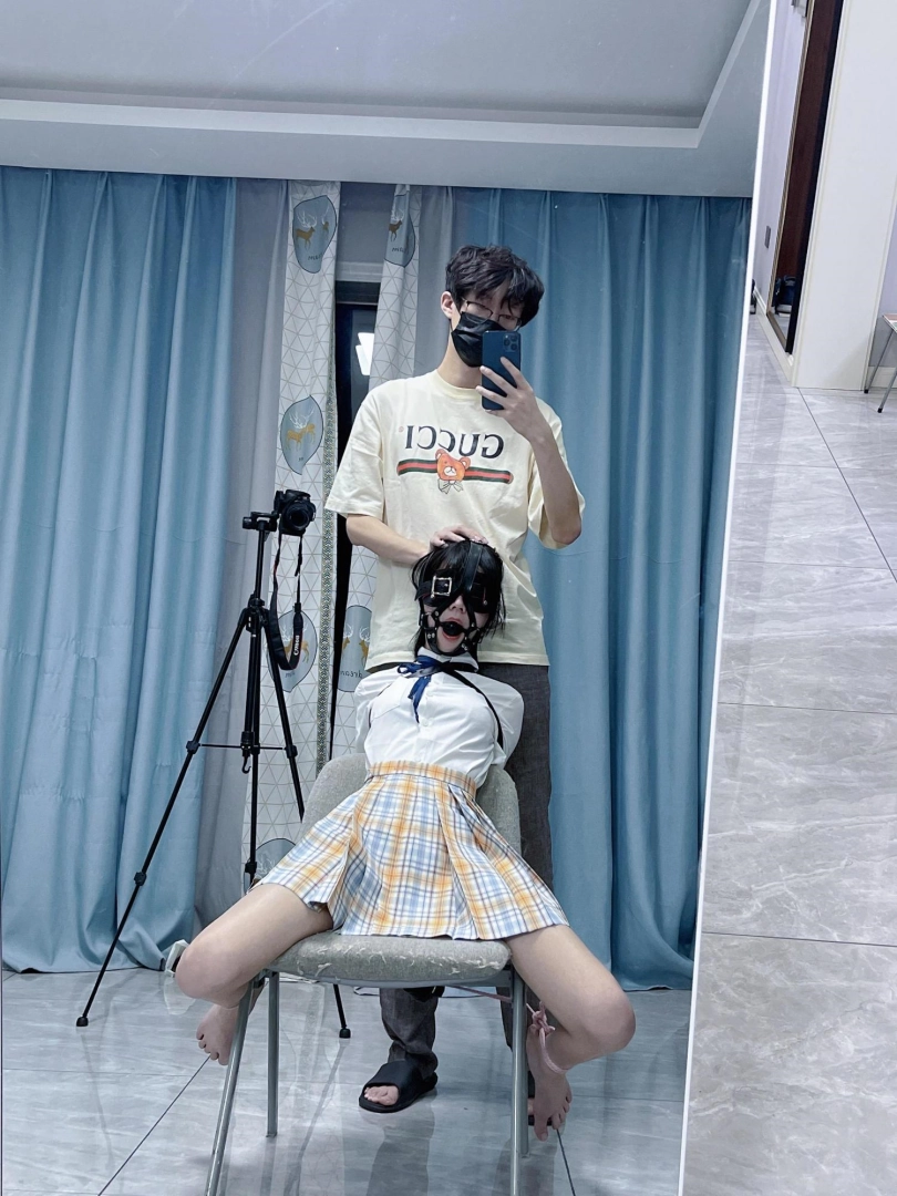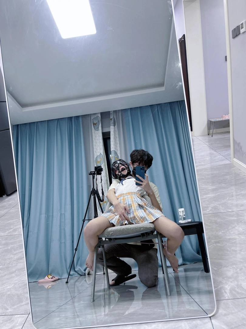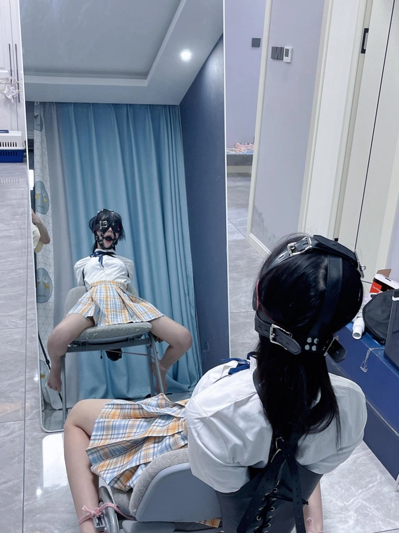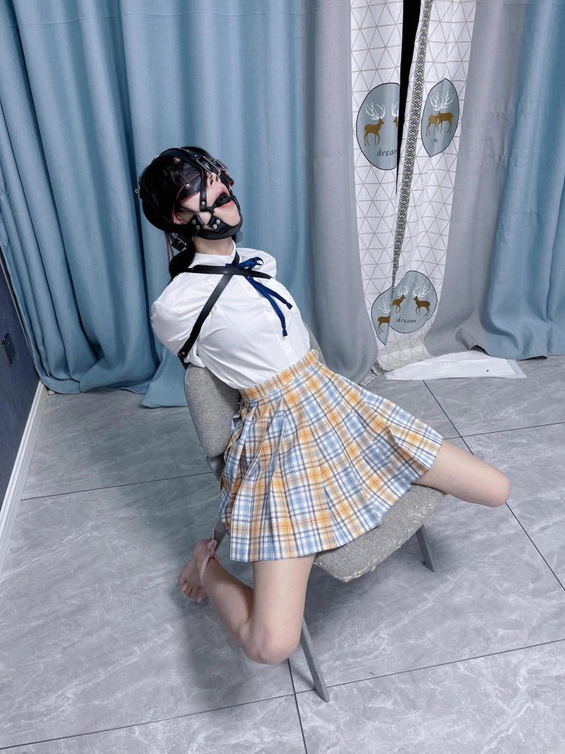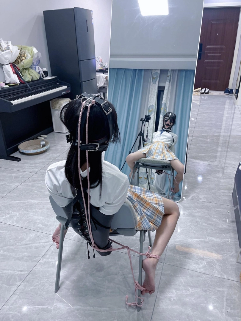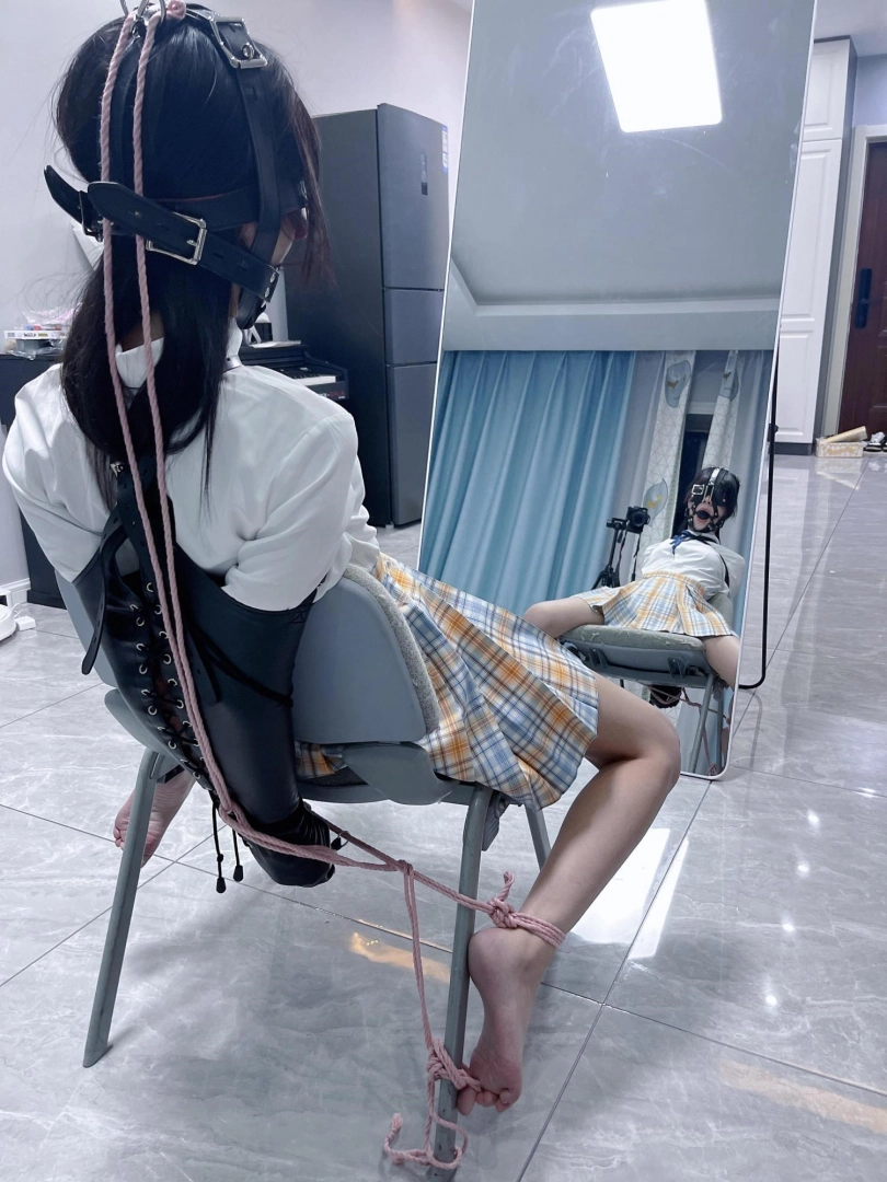 所以这一部我把穿着jk光着小脚的茶茶绑在椅子上,用单手套把双臂固定在椅子背后,然后拉起茶茶的脚腕,让茶茶的脚丫翘起,这样茶茶就被死死固定在椅子上,整个身体都向观众展示,没有一丁点从椅子上挣脱的可能。