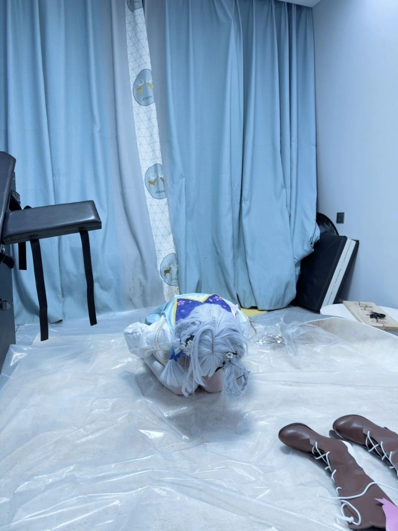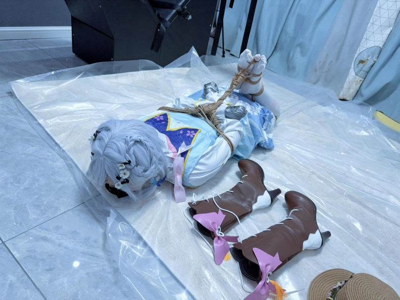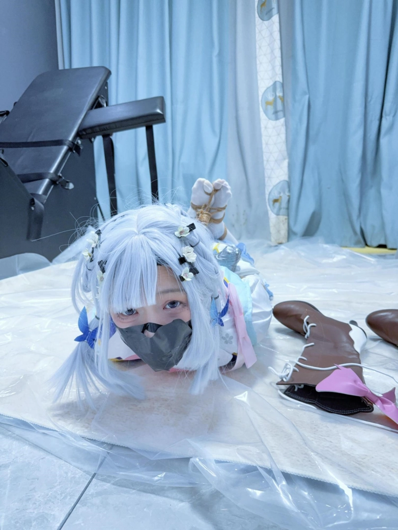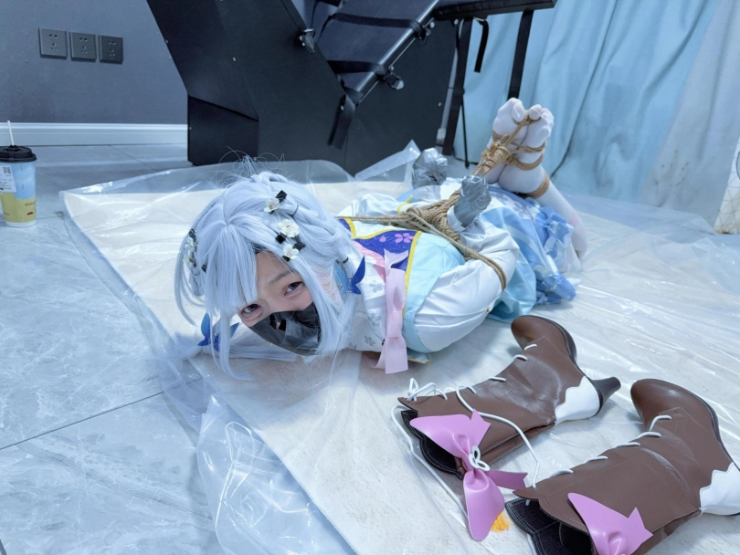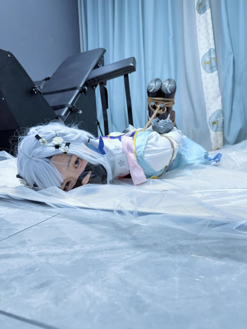 双手握拳,银色胶带包住小拳头,胶带包手~然后是一个经典的日式驷马,着重腿部拘束,膝盖、小腿、脚掌都用绳圈加固,值得一提的是高跟长靴也绕过脚掌绑上了绳子,并且把高跟鞋的鞋跟也绑在一起。
