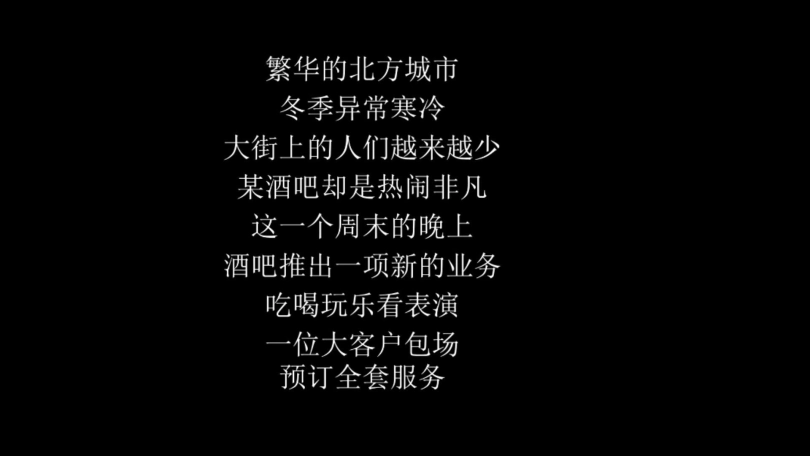 繁华的北方城市冬天异常寒冷,大街上的人们越来越少,某酒吧却是热闹非凡,这是一个周末的晚上,酒吧推出了一项新的业务,吃喝玩乐看表演,一位大客户出手阔气,包场预订全套服务。