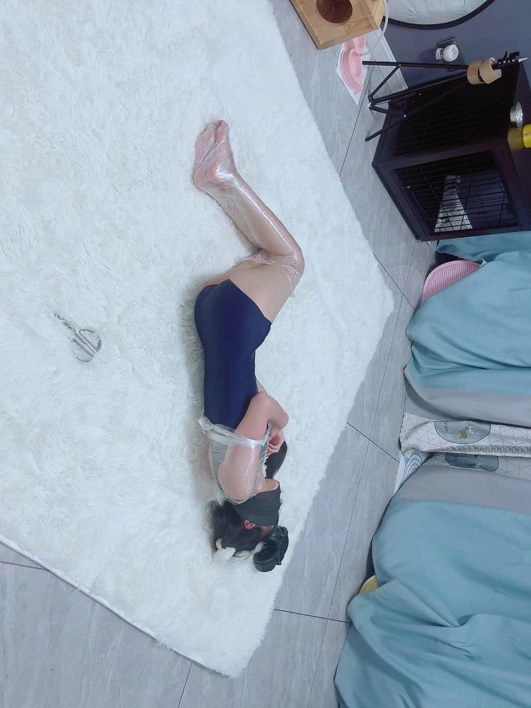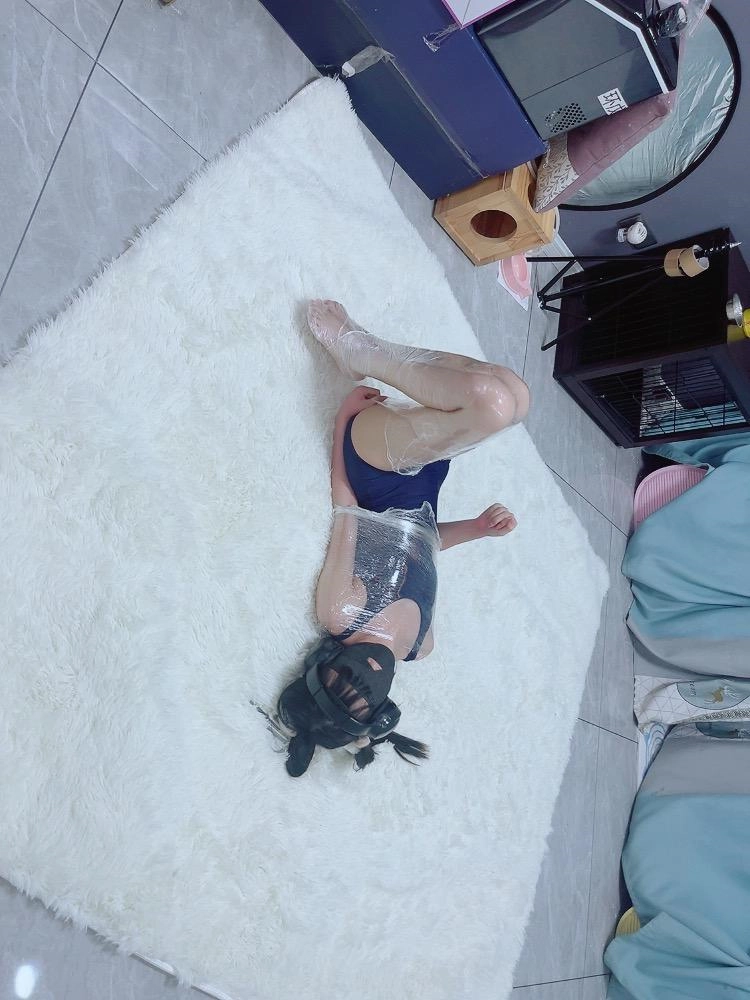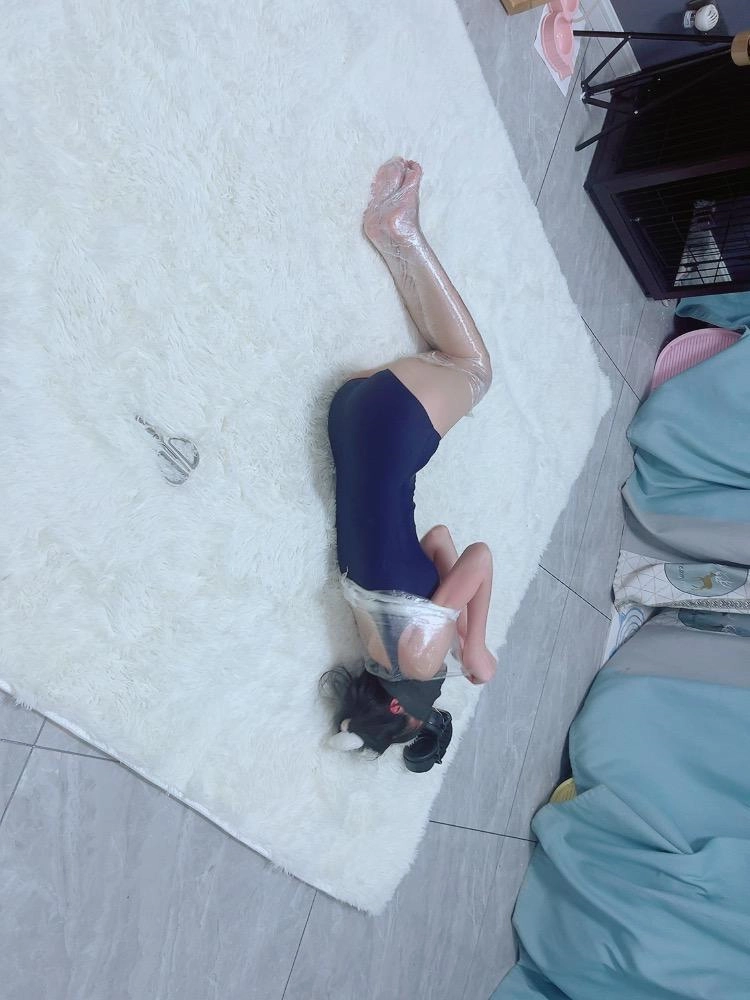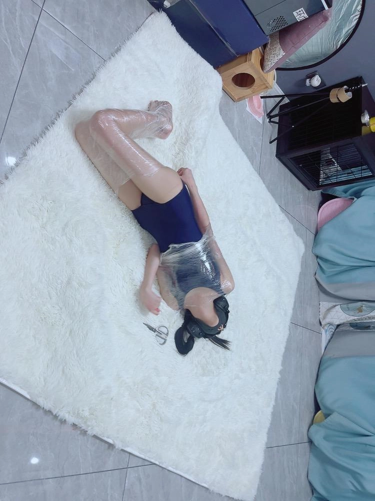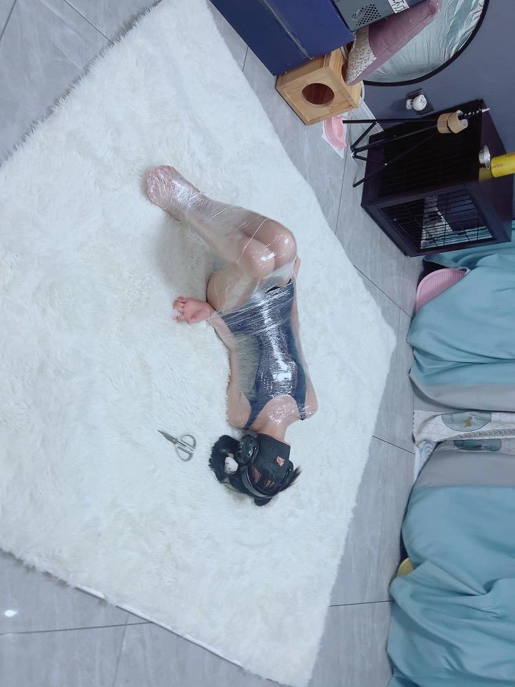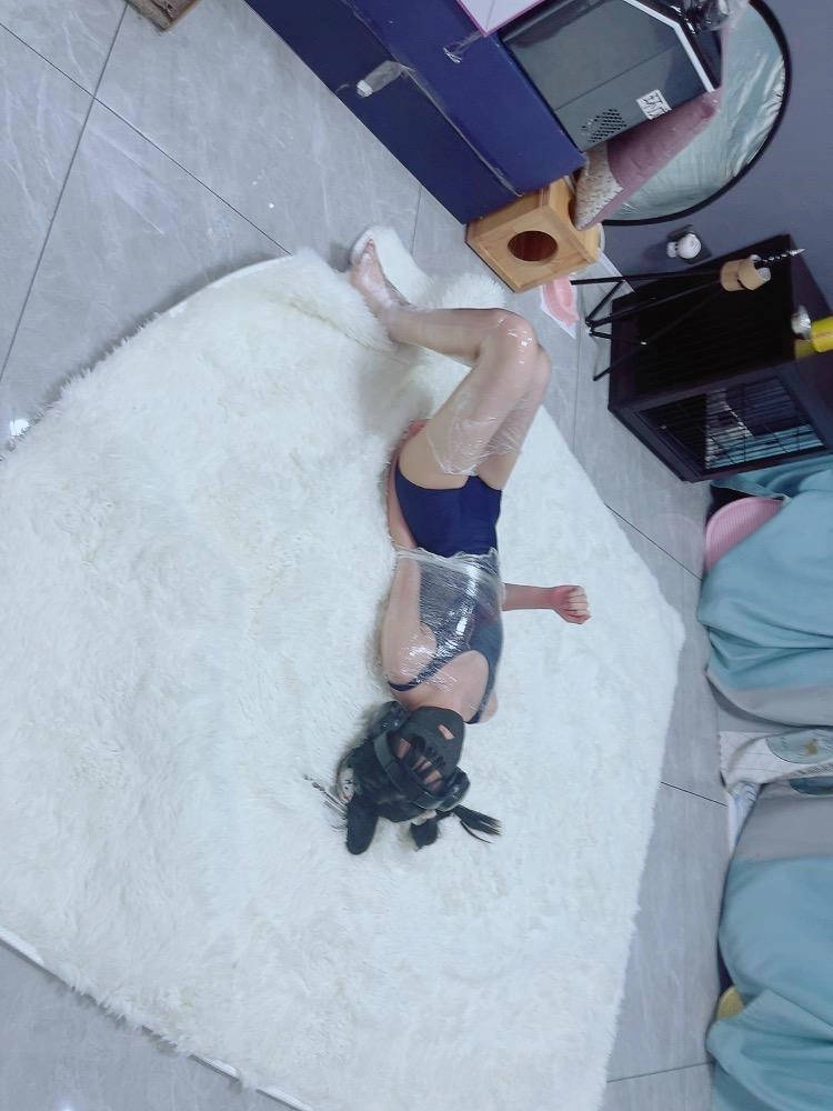 保鲜膜全包别有一番风味:完全透明的保鲜膜包裹着茶茶的身体,白皙的腿和粉嫩的脚底若隐若现,展示感拉满~可以透过保鲜膜完全看到茶茶在内部挣扎的状态,足控也能欣赏脚趾动弹的可爱样子。