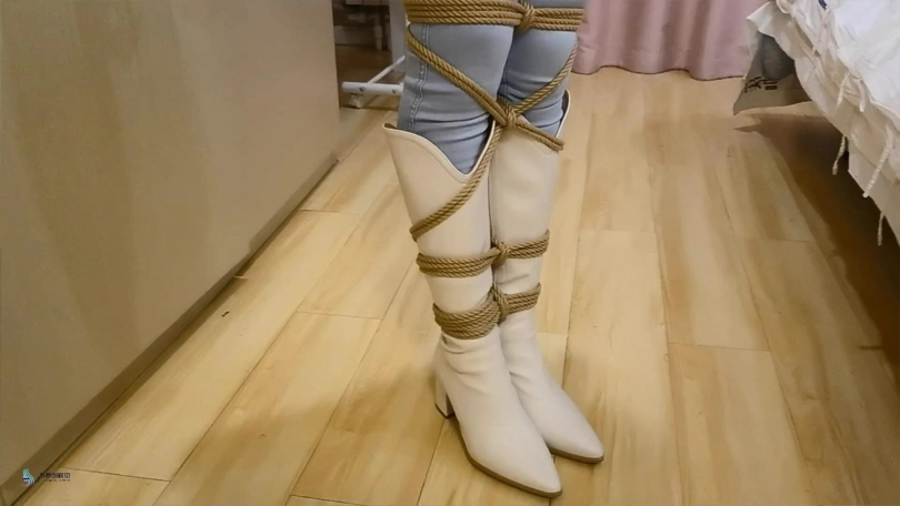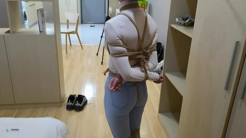 妹子穿着牛子裤和靴子。全身被绳子紧密捆绑.嘴里塞进丝袜,胶带封堵防止吐出来,套上丝袜头套,再用胶布缠绕固定,戴上口罩,最外面再缠几层绷带。妹子基本发不出声音。用棒棒刺激着下面。妹子只能默默的享受这种快乐。