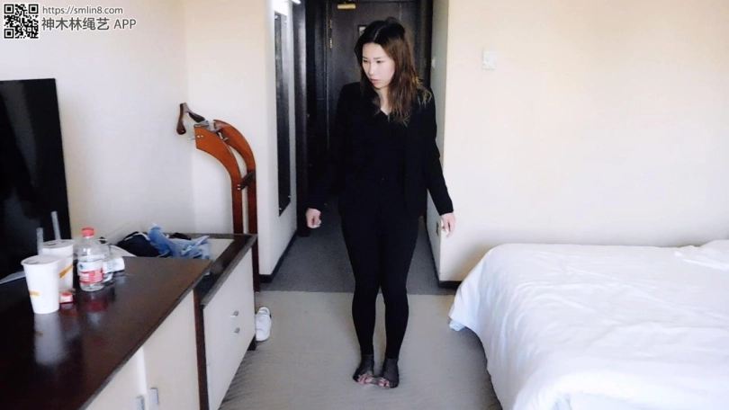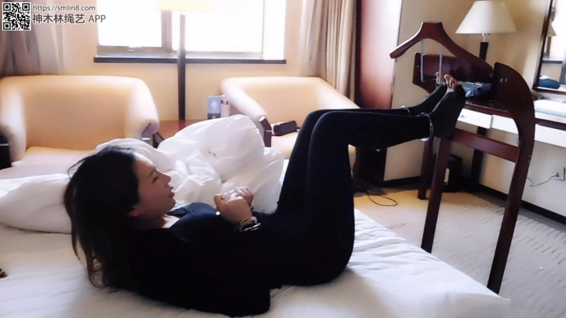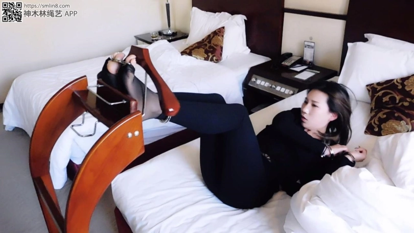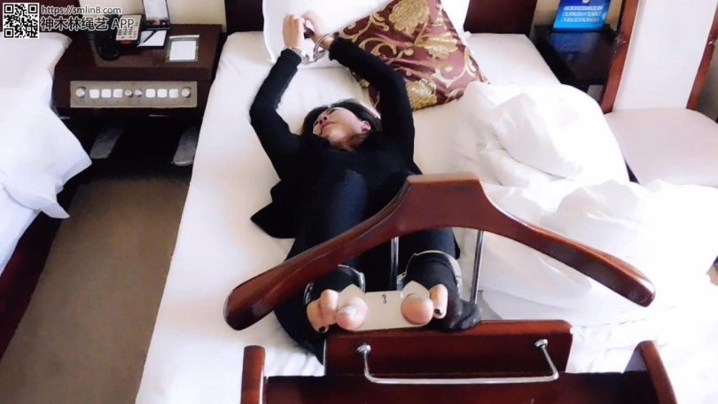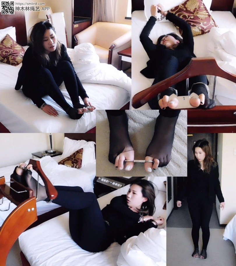 妹子下班回家,躺床上就睡了。这时,偷偷潜伏在屋内的坏人出动,掀开被子,撕开丝袜,锁上脚趾铐,再盖上被子。妹子睡醒,发现身体有点不对劲,掀开被子一看,发现被戴上了脚趾铐,很诧异。妹子下床,各种找钥匙,却找不到,很着急。坏人再次出现,拿来一个架子,解开脚趾铐,把脚趾吊在架子上,然后锁上脚腕、手腕、拇指,离开了。妹子彻底绝望,十分疼痛。