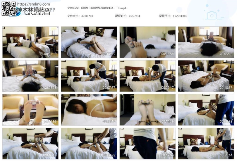 妹子自己回来,然后有人敲门,妹子好奇打开了门,遇到坏人绑架,坏人放到妹子,戴上手铐。脱下鞋袜,锁上链子脚趾铐、脚铐,手脚用板铐连起来,驷马锁住。妹子挣扎喊叫,恐惧。坏人出现,先解开一半的手脚铐,脱下,脱下衣服,只剩下内衣,再全部锁好,换上2个脚趾铐。妹子内衣挣扎喊叫,恐惧。坏人再次出现,拿出三筒把脚腕脚趾连起来,然后开始挠脚心。后来换个角度。