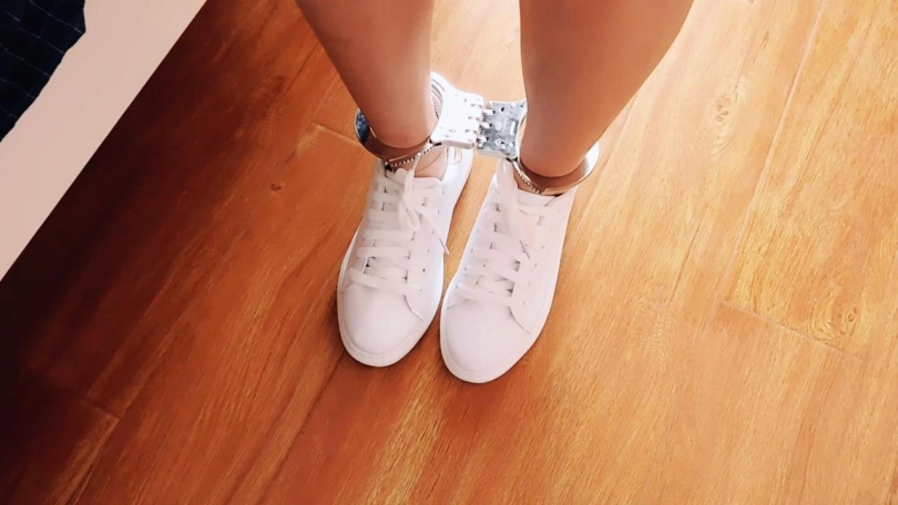 妹子先戴着板铐,展示、走路。妹子解开,换上脚铐、脚趾铐,脱下鞋袜,展示、玩玩具。妹子带上手铐,展示、玩玩具。