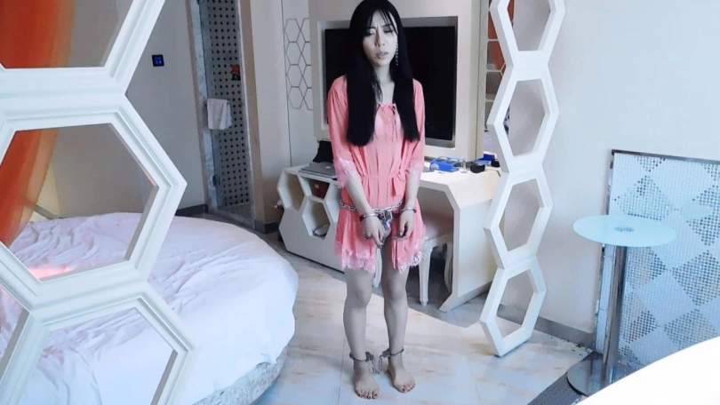 妹子是个毒贩,正在酒店里准备等着交易。突然警察破门而入,让妹子蹲下手抱头,询问姓名,寻找毒品。警察找了半天也没找到毒品,上下打量妹子,忽然感觉鞋里面有问题,强行脱下妹子鞋袜,在袜子里发现了毒品。于是给妹子戴上了背铐、脚镣。妹子蹲在地上,一直不承认自己的错误,哭了,喊冤。警察十分愤怒,给妹子塞入[不可描述],腰上锁上链子,解开手铐锁在前面连接在腰上,要求妹子走圈,算作惩罚。妹子被迫艰难走路,十分难受,仍然拒不认错。警察更加愤怒,加上脚铐、锁上脚趾,要求妹子继续走几步,更加严厉的惩罚。妹子走路十分疼痛,终于求饶,交代了她所知道的情况。最后警察解开脚铐、脚趾铐,戴上眼罩,把妹子带走。