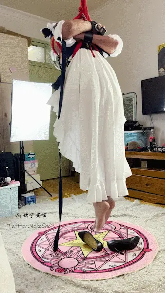 自缚和起吊过程虽然略显耗费时间但也还算顺利,但是吊起来不久后我就意识到手腕这回吊得太高了……因为裙摆的关系不能捆胯绳,吊缚受力也全靠腰绳和胸绳,长时间的悬吊压迫也让我有点喘不过气来,再加上手腕吊太高了根本无法发力,最后脱力了也没能把手腕解开……还好恰好家里有朋友来做客,无奈最后只能喊人解开,不然后果就不堪设想了……