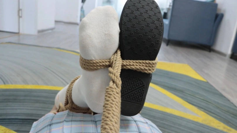 (工作人员只解开连在琪娜脚腕和后背的绳子,然后将琪娜绑着的双腿再大小腿折叠绑在一起,随后在客厅沙发上的角落处放一捆绳子)