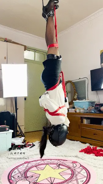 脚踝使用了吊缚用的铐子,质地坚韧而且不会很勒(甚至很舒服),为了防止铐子因为重量过大崩开,在膝盖和胯部加了绳子进行辅助受力,上半身则是单独捆绑。