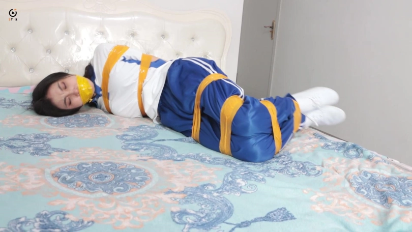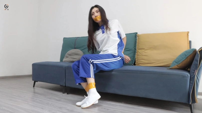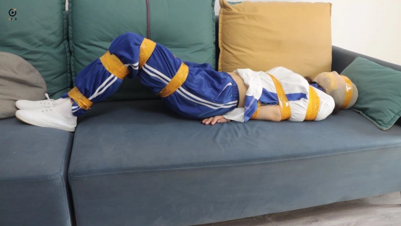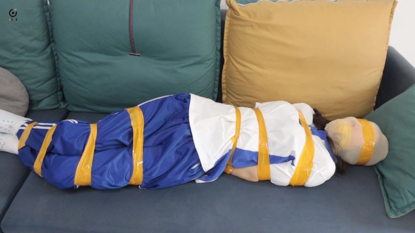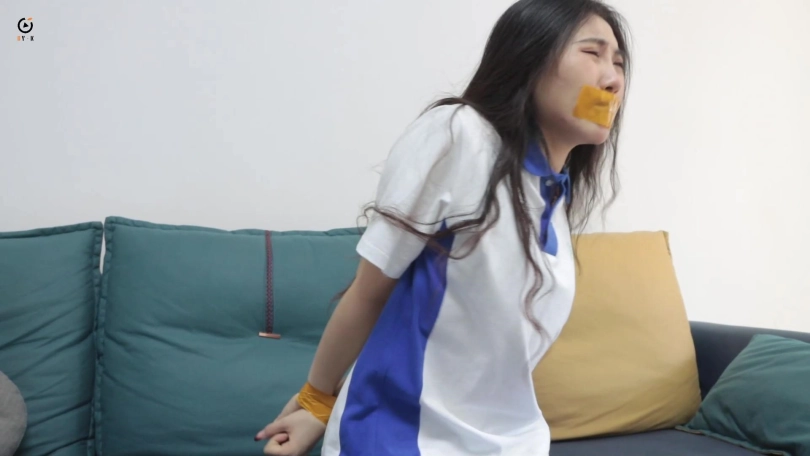 女学生在家午睡没想到遭遇入室抢劫,歹徒用黄色胶带捆绑手脚封住嘴,放置在沙发上挣扎,女学生试图逃跑被歹徒抓了回来,被歹徒用胶带进一步捆绑的更加结实,歹徒抢劫完财物以后对女学生起了色心,并且最后用丝袜套头胶带封住眼睛。