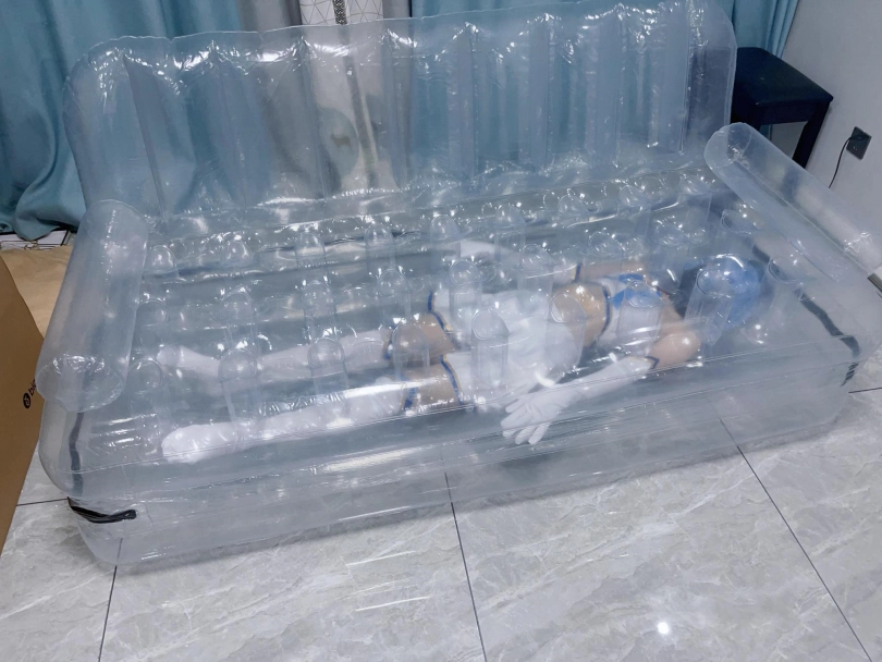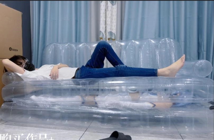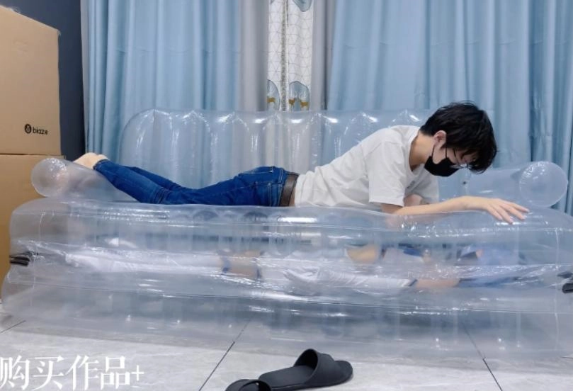 充气沙发没有换气孔,只能类似真空袋一样,呼吸残余的空气,控制氧气呼吸,十分闷热~