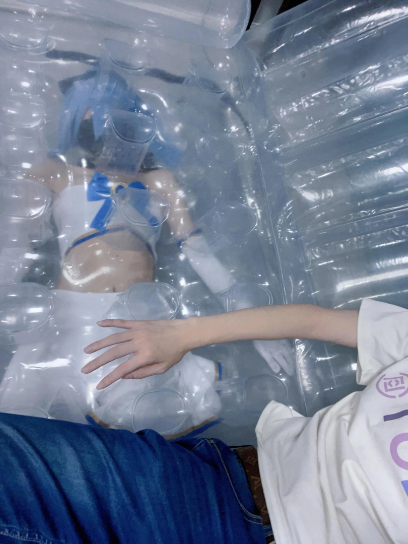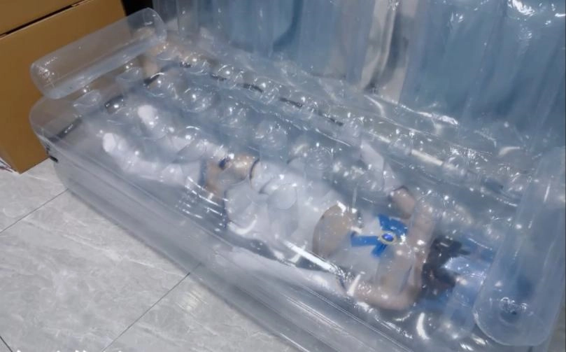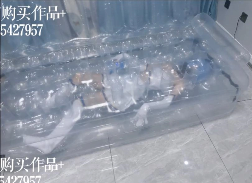可怜的露娜酱就这样被封印在透明的充气沙发里,忍受着闷热、缺氧和充气拘束的压迫感,被人使用着。