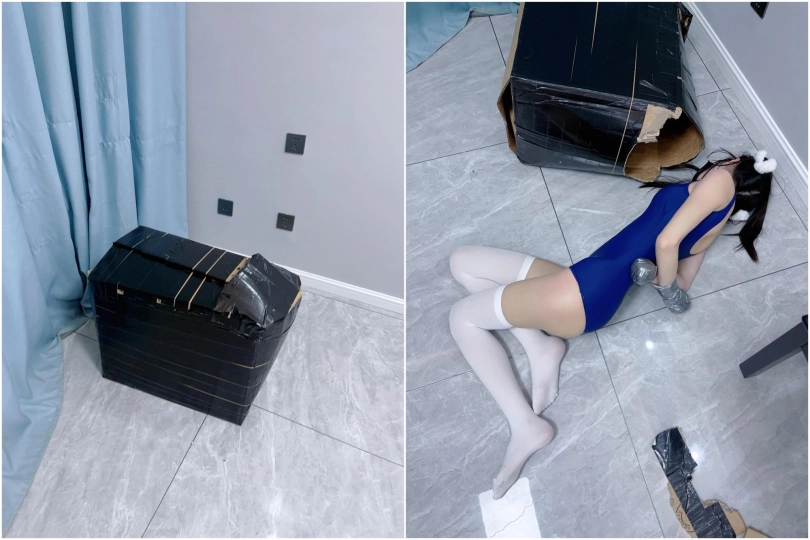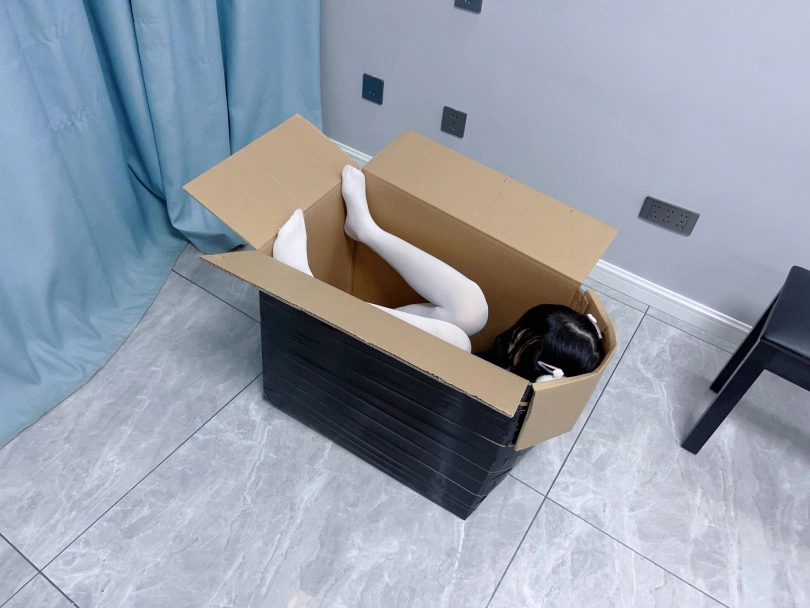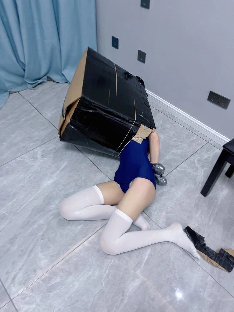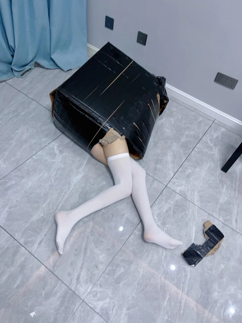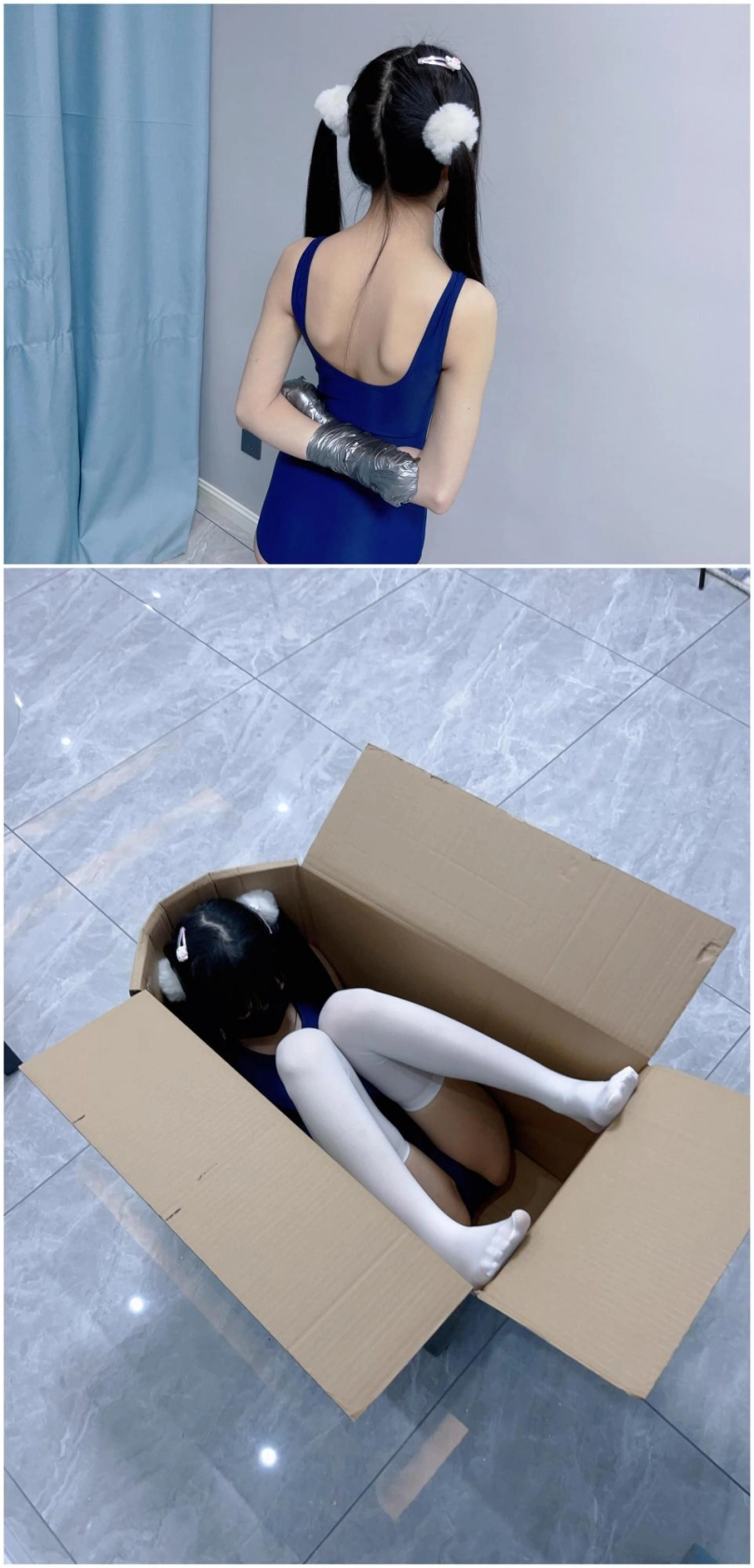 装箱脱出挑战第二部来啦!这次让茶茶穿上白丝死库水,难度升级哦———这次会把茶茶的双手握拳用银色胶带包裹好,然后把茶茶双手背缚,两个小臂死死反绑在一起,绝对没有用手辅助脱缚的可能!